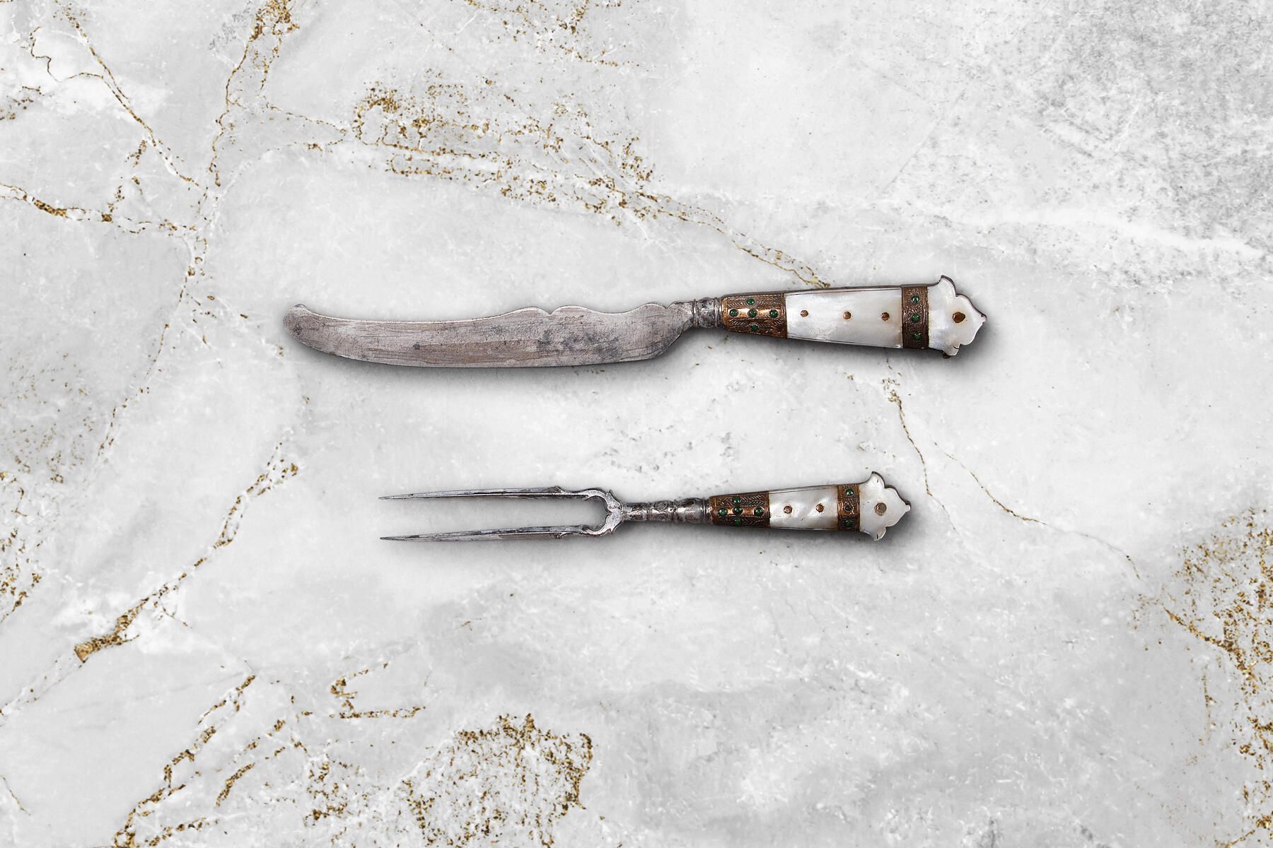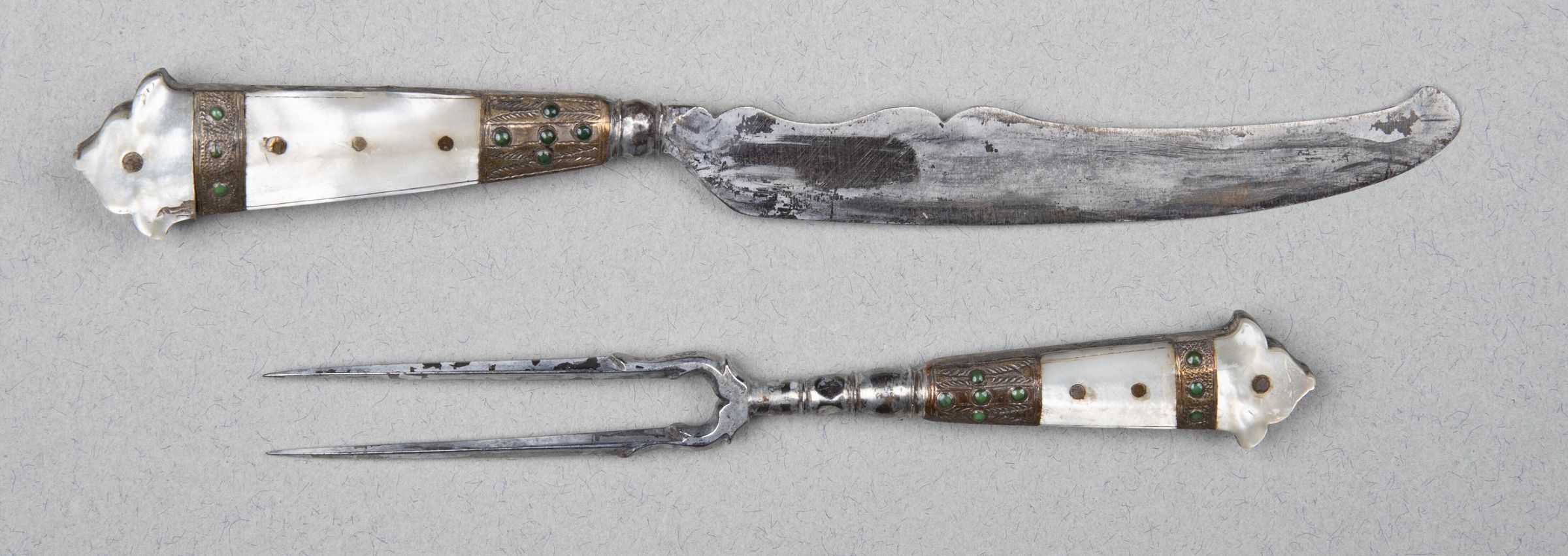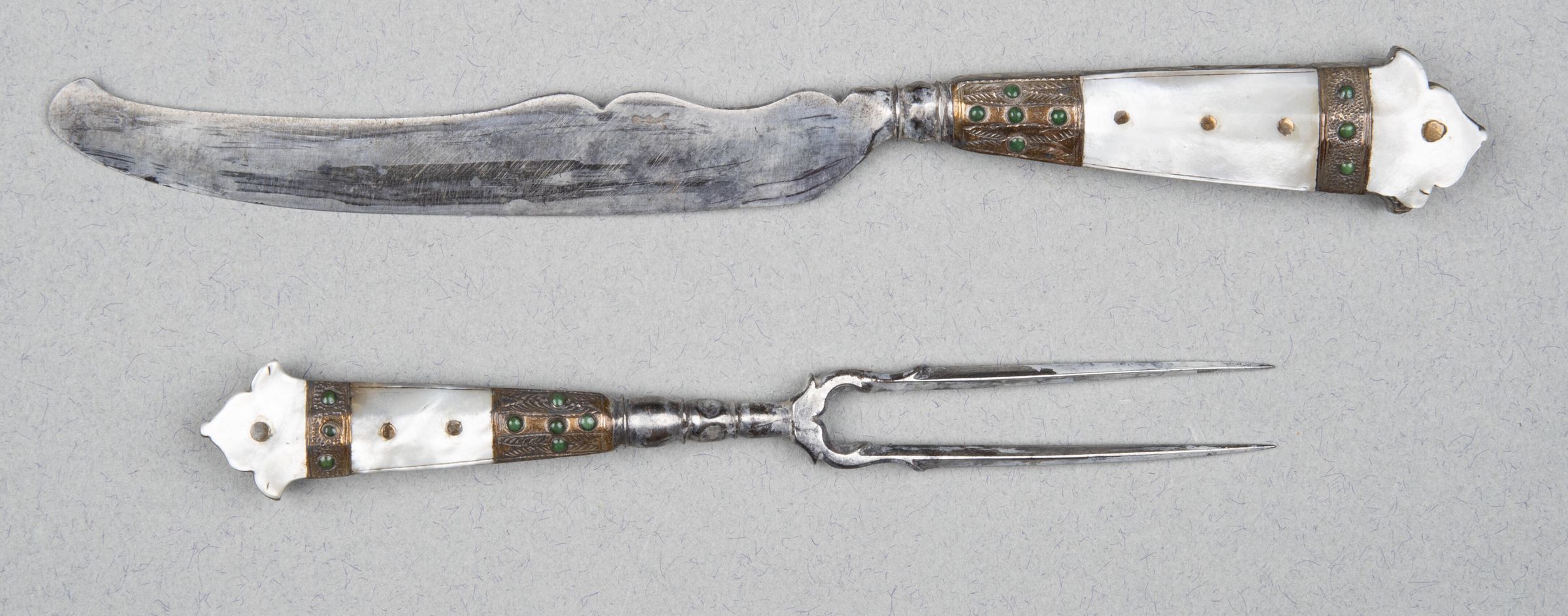 Handles: Flaring in shape, with three facetted mother-of-pearl scales on each side, the edges of silver engraved and chiselled with banding and acanthus foliage. The ferrule of engraved silver is set with five stained horn beads on each side. A band of matted silver, similarly inlaid, separates the handes from the trefoil ends.Collection