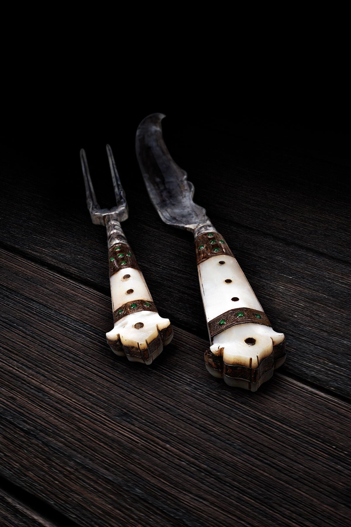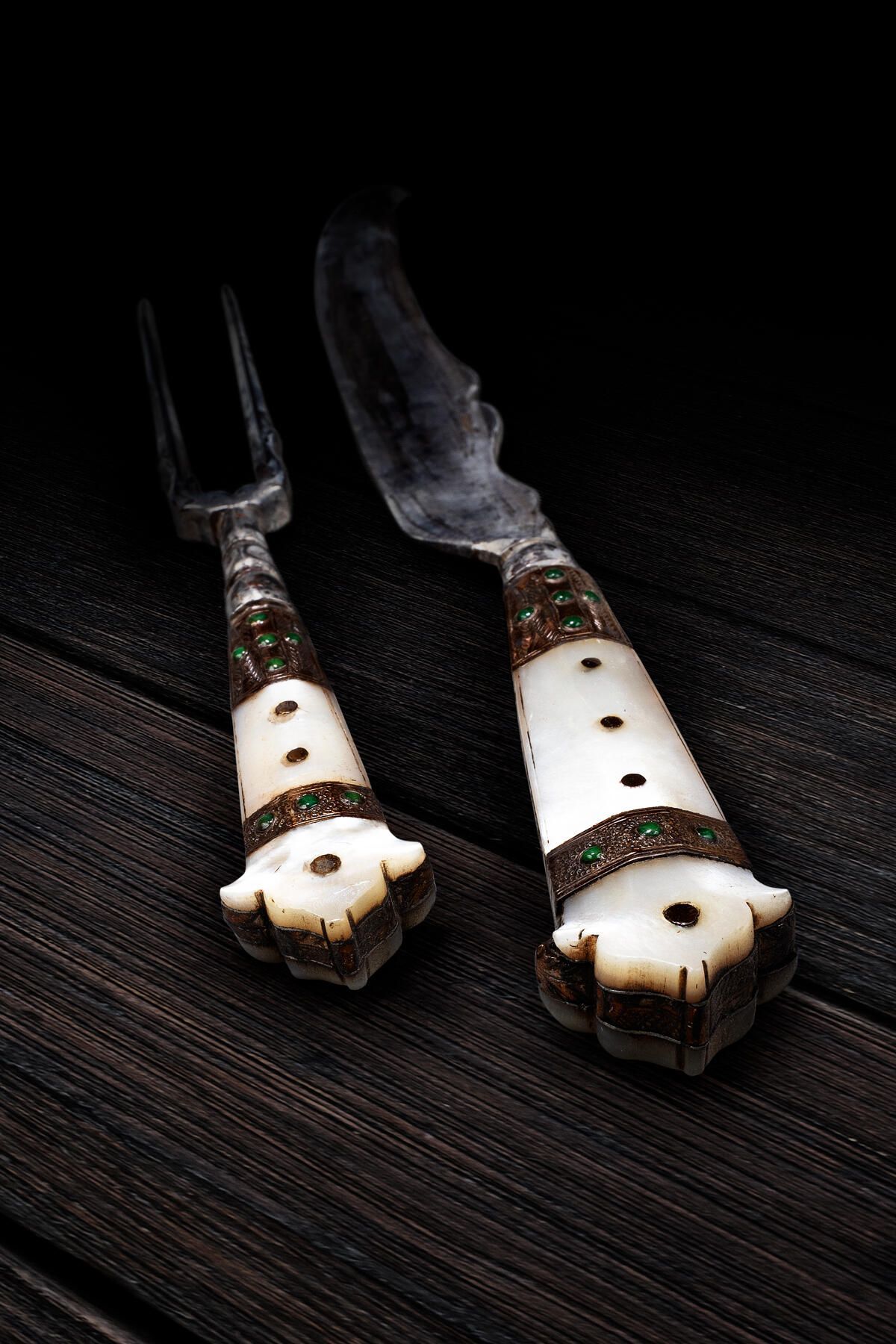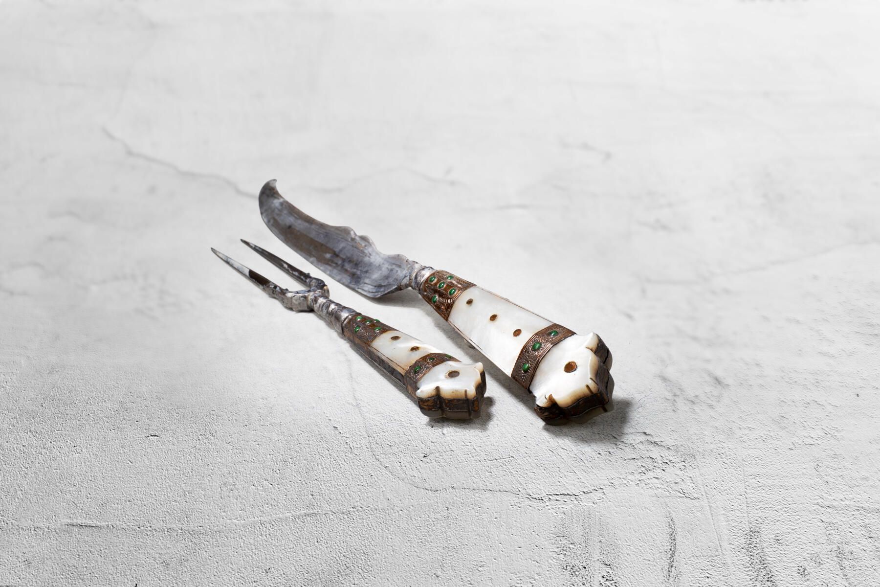 Handles: Flaring in shape, with three facetted mother-of-pearl scales on each side, the edges of silver engraved and chiselled with banding and acanthus foliage. The ferrule of engraved silver is set with five stained horn beads on each side. A band of matted silver, similarly inlaid, separates the handes from the trefoil ends.Collection