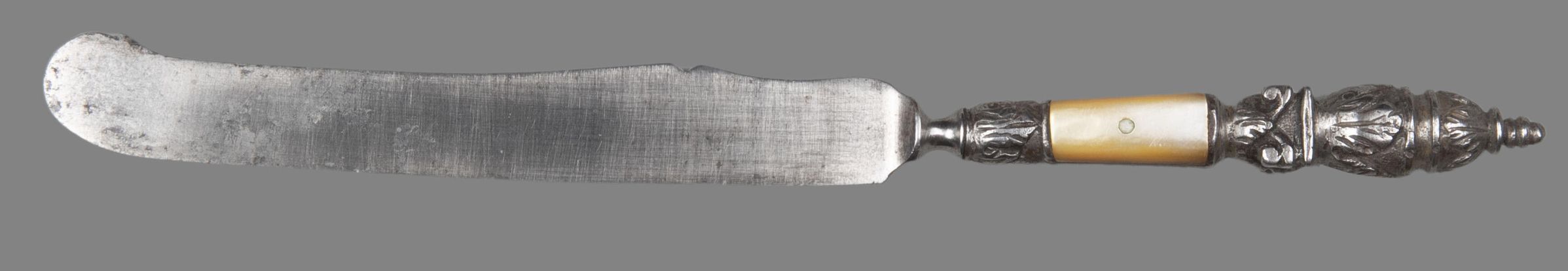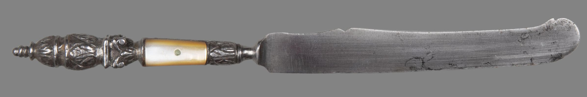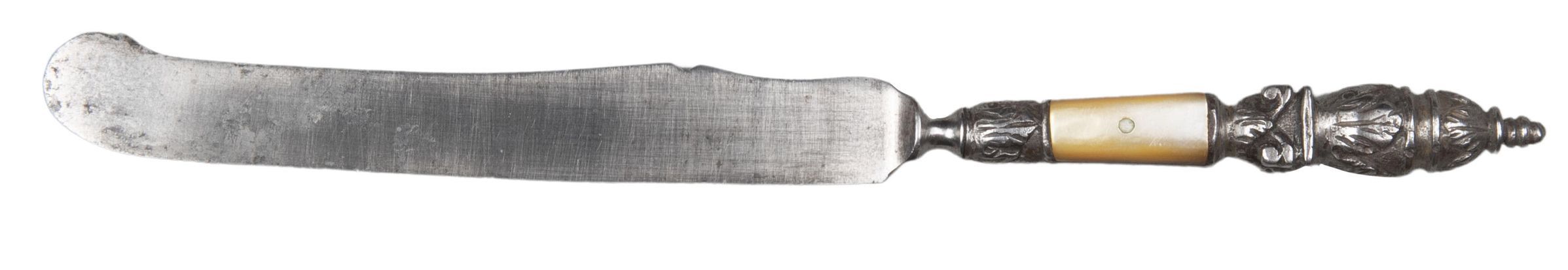 The handle of steel is chiselled in four stages; the lower with a calyx of acanthus leaves, the next with two panels of mother-of-pearl scales applied to it, the next a Corinthian capital and the top an ovoid urn shape.Collection