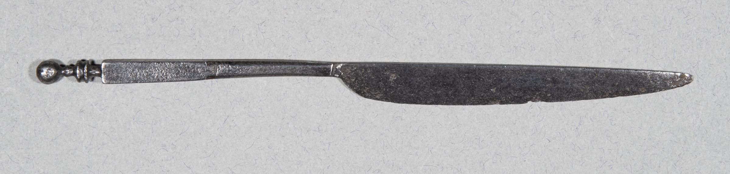 The handle integral with the slender blade which tapers to a point, with a swaged upper edge. The slender flaring handle with a rounded lower and rectangular upper half, the finial globular.Collection