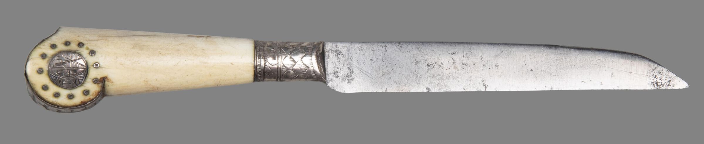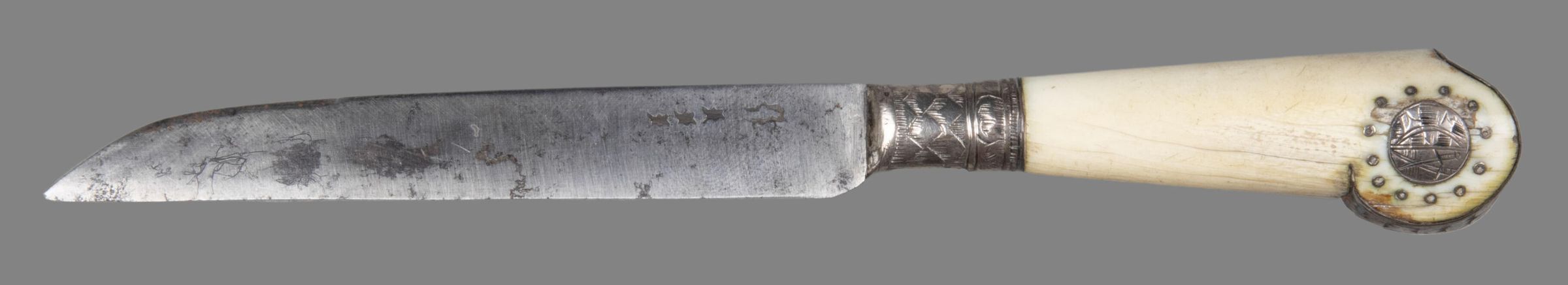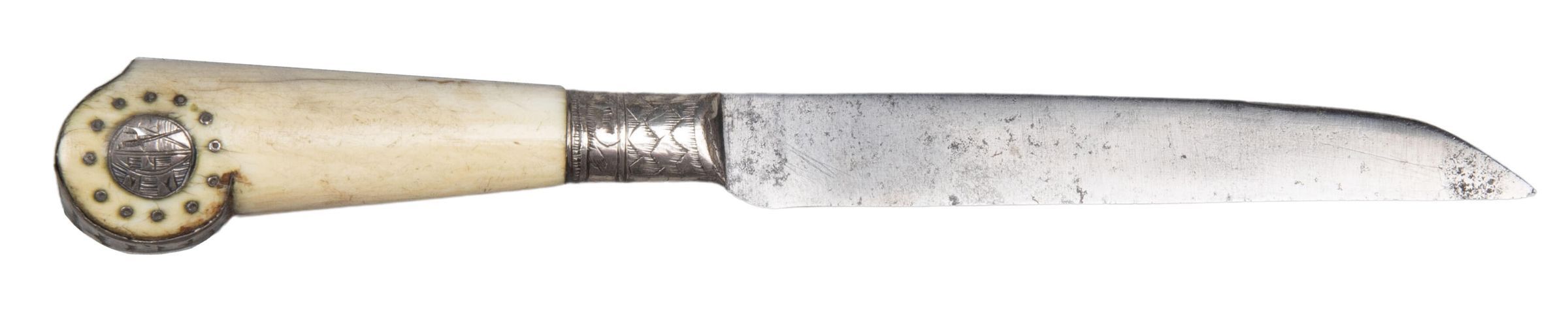 The blade straight-sided, the upper-edge tapering towards the point. The bolster covered with the silver of the ferrule which is engraved with imbrication. The ivory handle an adaptation of the pistol shape, the moulded end being covered with silver sheet also engraved with imbrication. A circular plaque with the arms of Saxony set into both sides of the end volute, surrounded by silver pique work.Collection