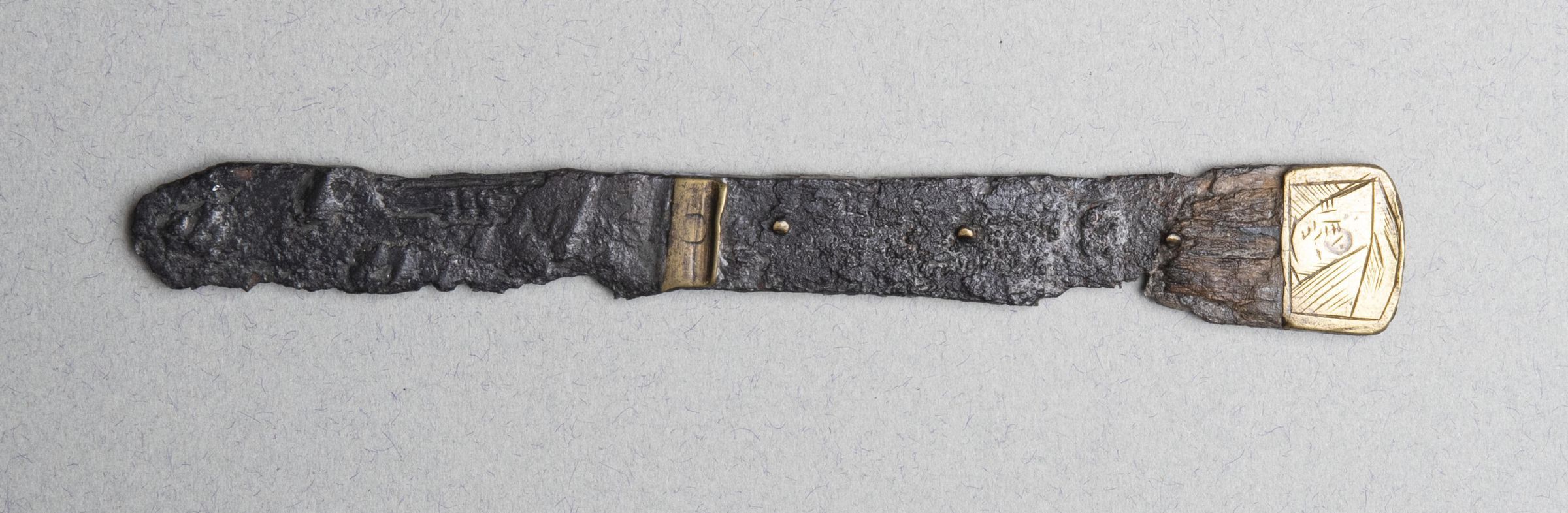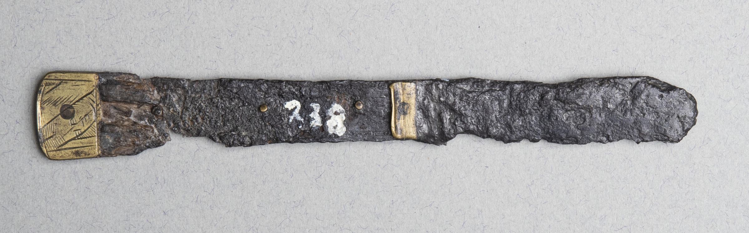 An extremely corroded single-edged blade with parallel sides.