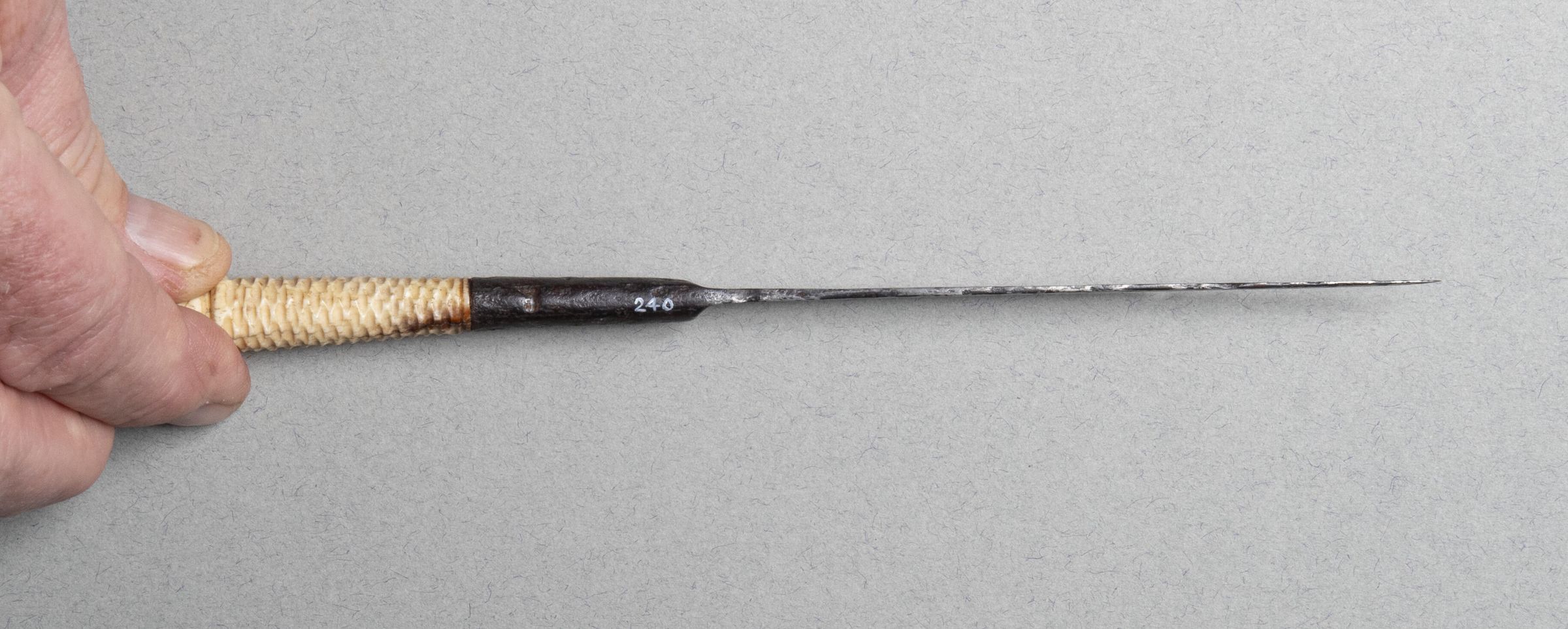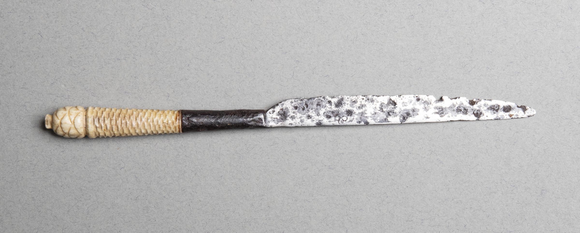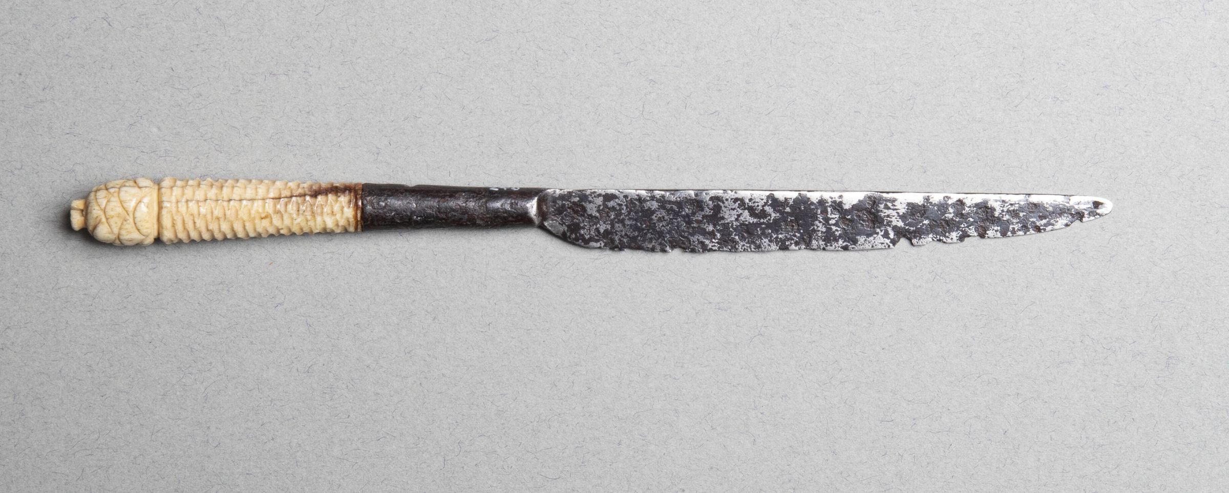 The slender blade tapering to a point and integral with the long bolster. The upper part of the handle of ivory, flaring and carved with honey-comb pattern, and crowned by a pine cone.Collection