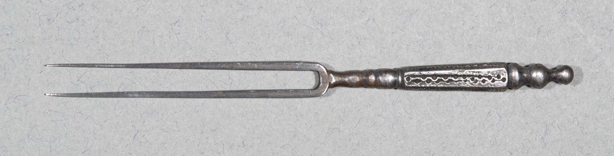 Head made of steel in one with the handle, with two long, straight, sharply-tapering tines on a short baluster neck. Handle slightly tapering, of rectangular section with chamfered edges, surmounted by a waisted bottle-shaped finial; the faces are etched with longitudinal recessed wriggle-pattern lines.Collection