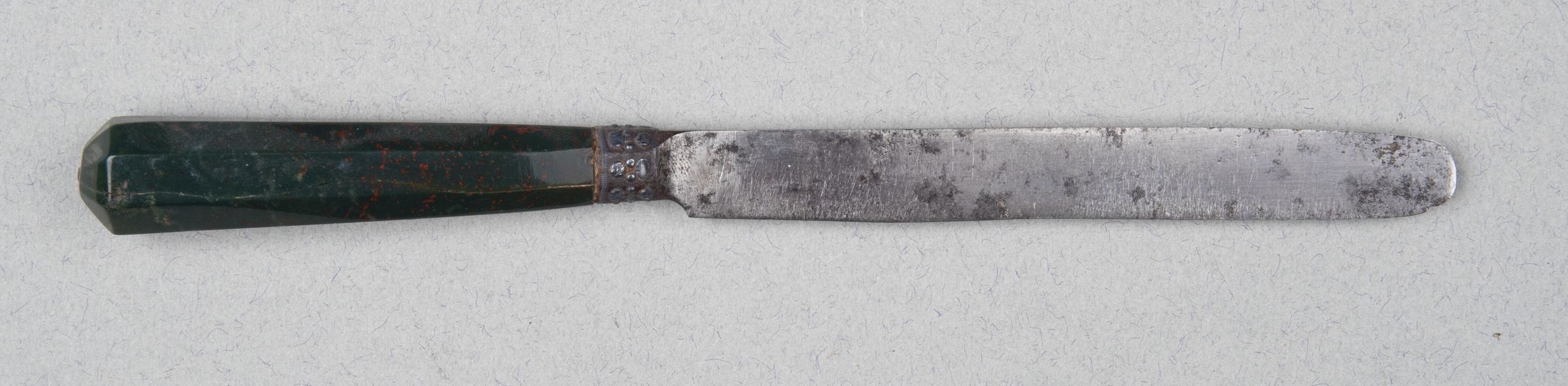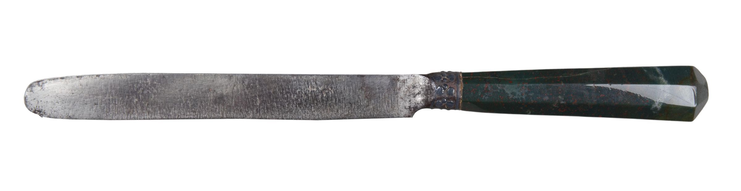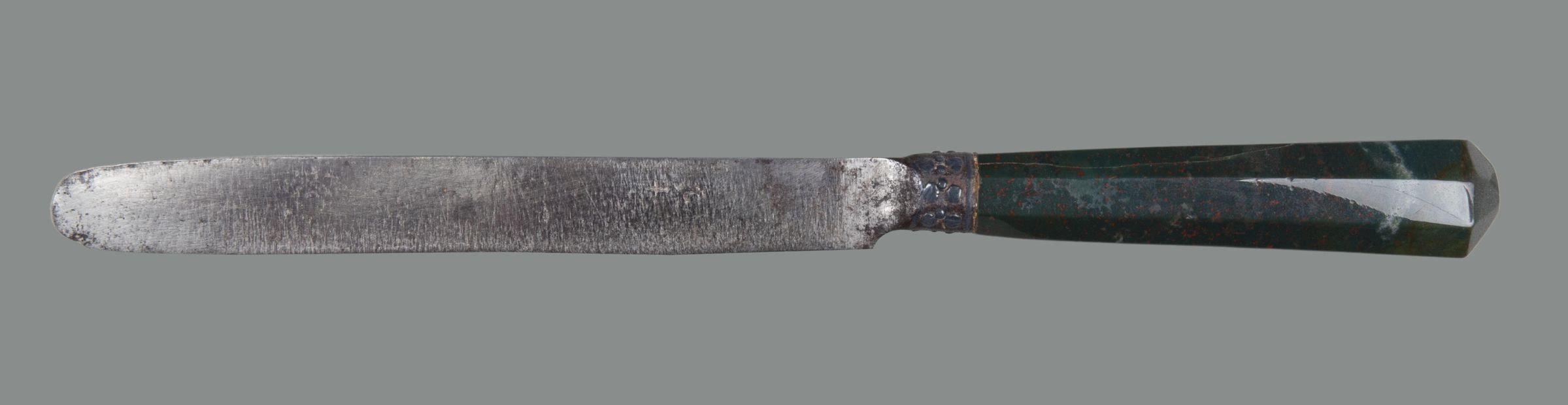 Blade single edged with almost parallel edge and back, with rounded point; bolster of octagonal section encrusted with silver rosettes and pellets. Handle tapering, of octagonal section bloodstone with domed top.Collection