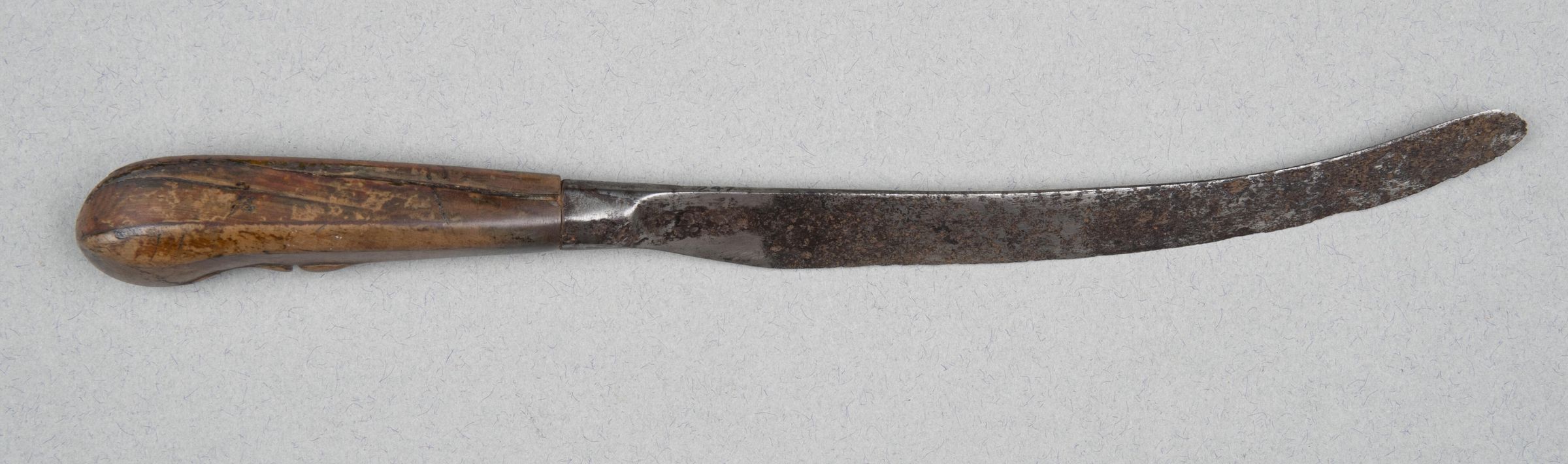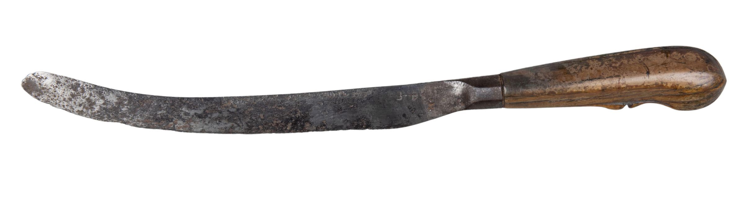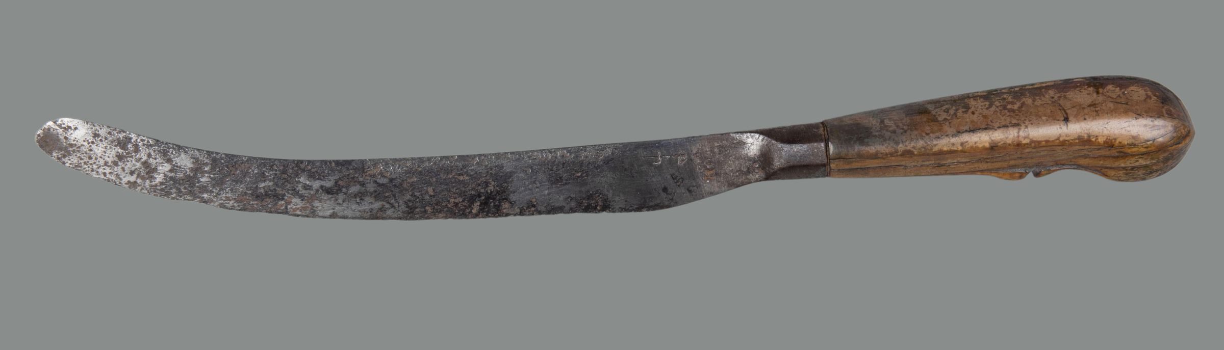 Blade scimitar-shaped, long and tapering with a rounded point, much worn down and corroded: the plain bolster fits directly into the handle. Handle of horn, pistol-shaped and diamond-shaped in section with rounded corners; a carved grip below pistol-endCollection