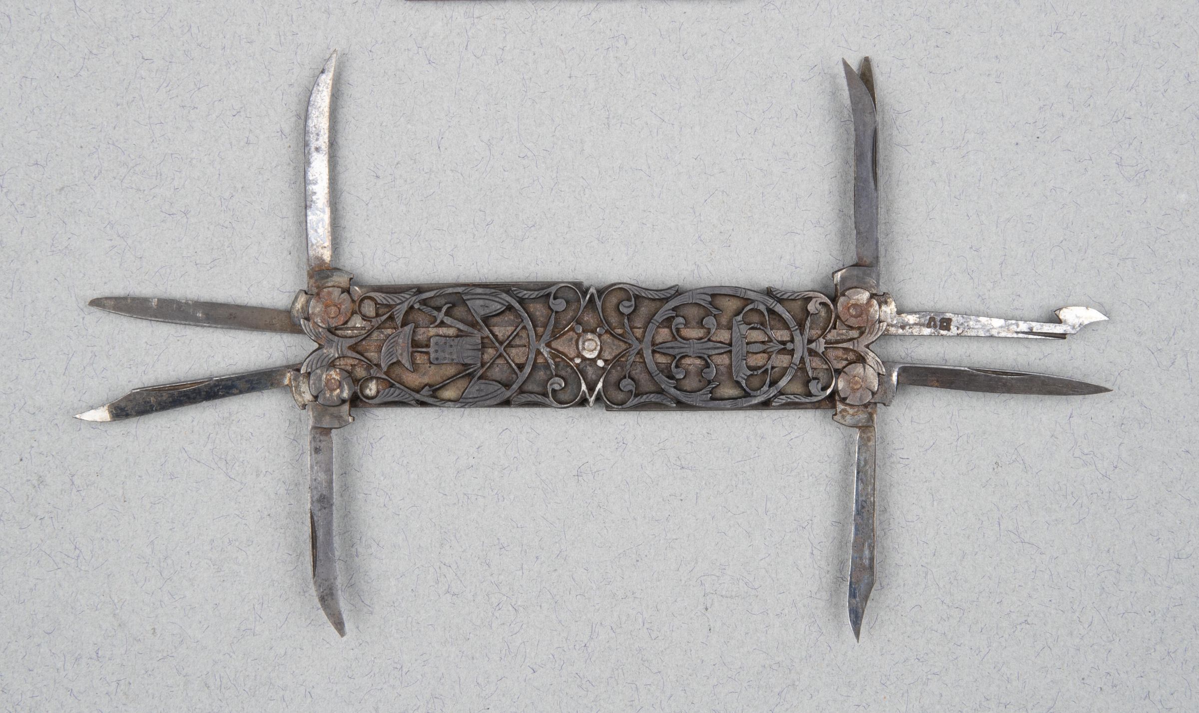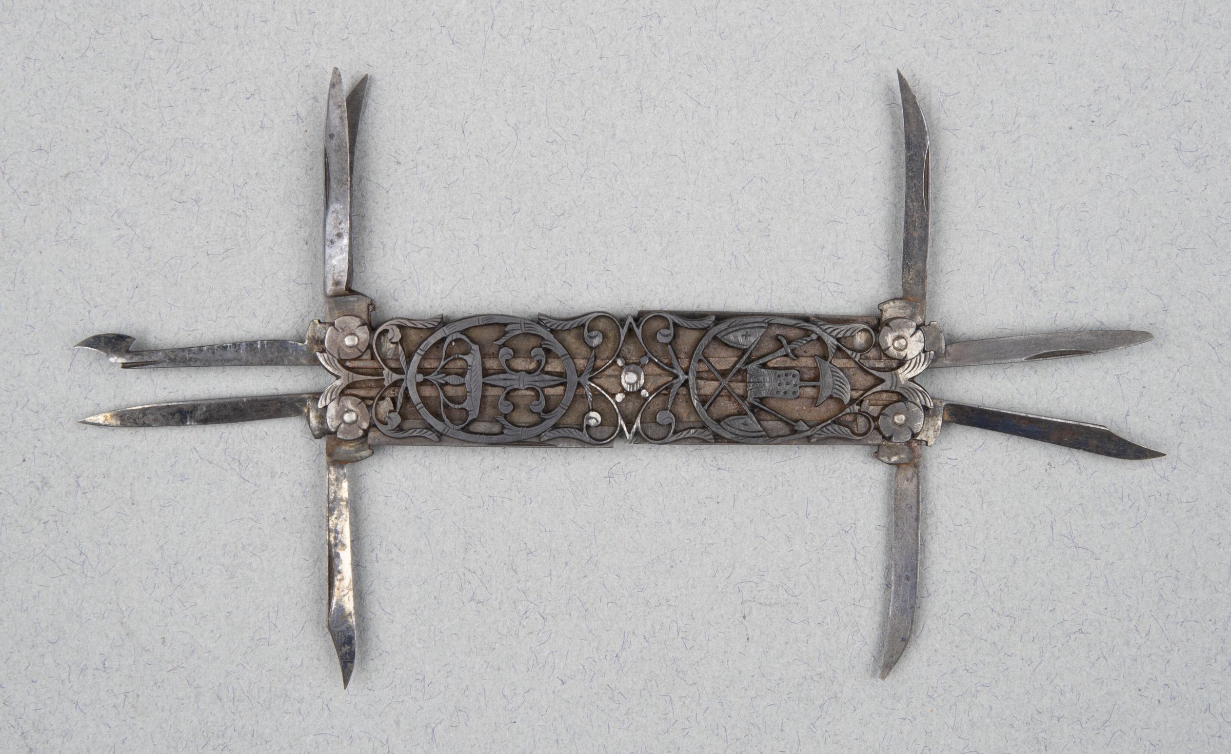 12 slender blades with points of varying shapes including a 'fleam' for bloodletting. The other blades may be lancets. The pierced and engraved steel handle has panels containing a crowned fleur-de-lys and a trophy of arms under a cap of Liberty on both sides.Collection