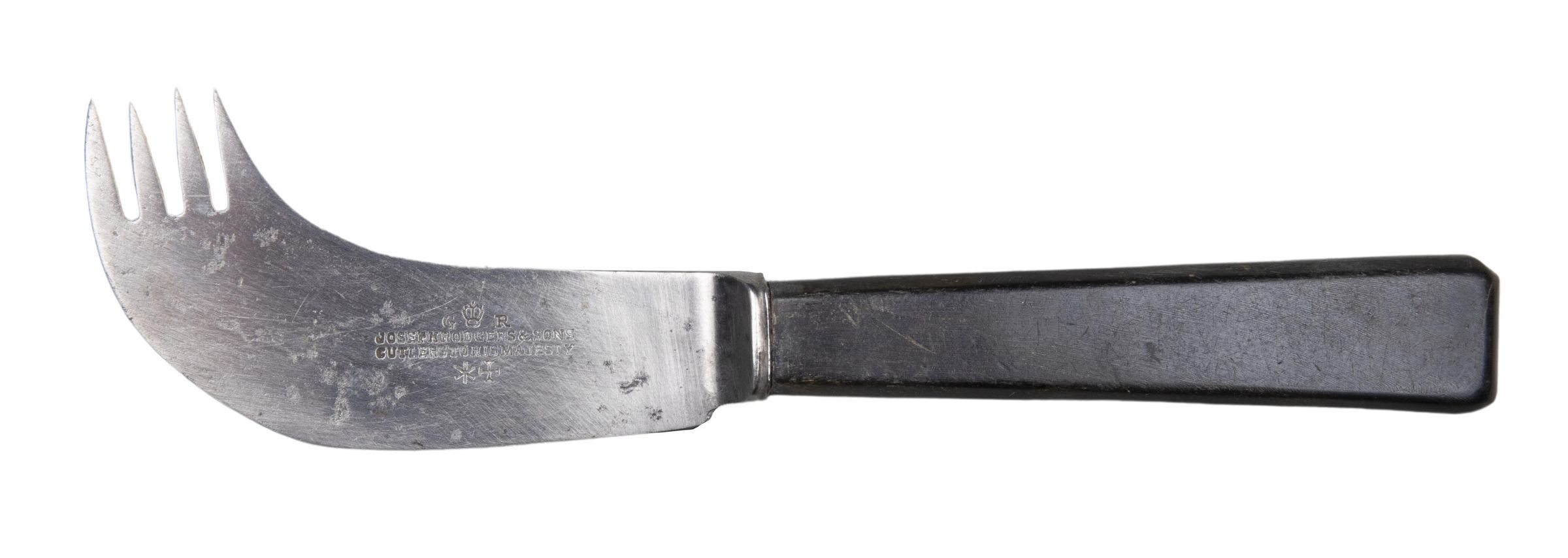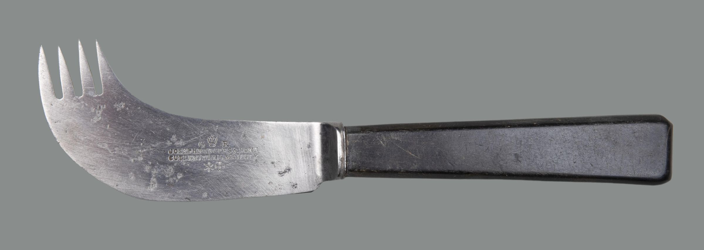 Knife, combined with fork, and leather sheath for a one handed manEntry/Object ID