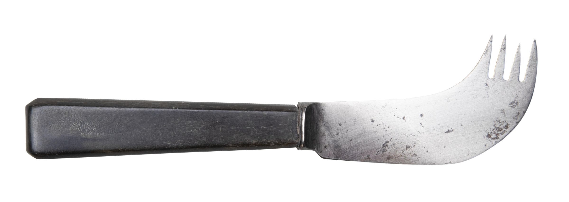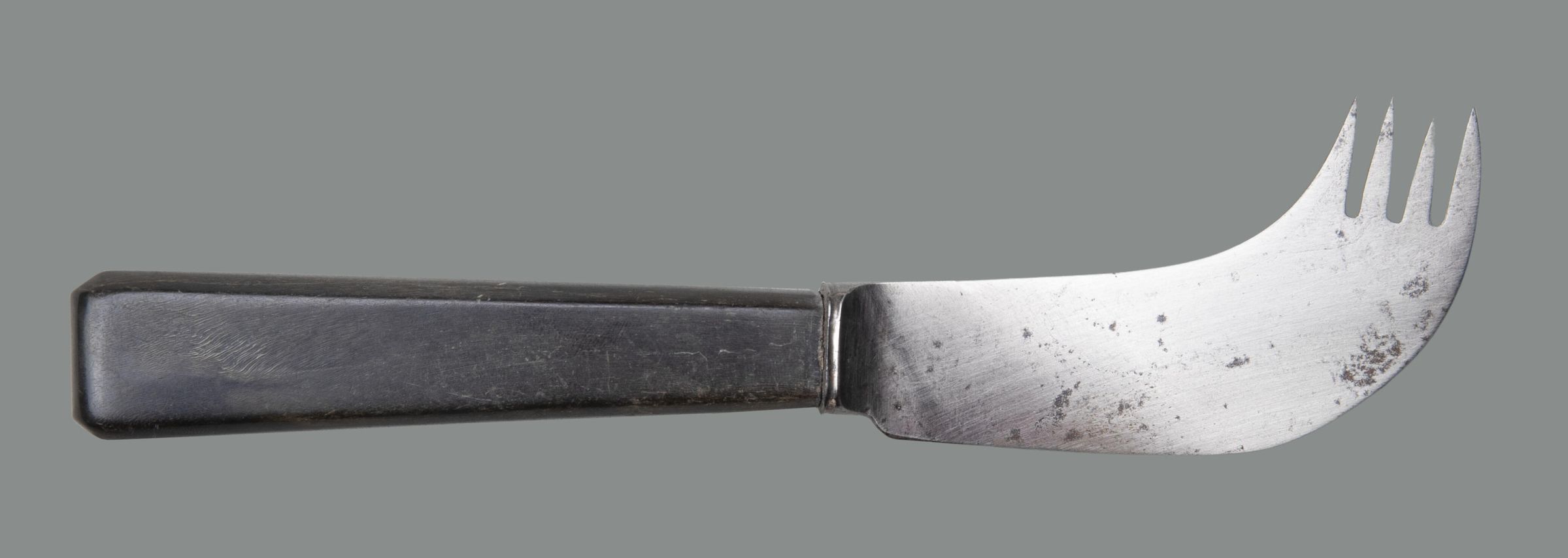 256.01 Knife: Blade of flat spatulate form, with a single edge curving up at the end to form a three-pronged fork, the curve sharpened to a razor edge. Handle of black, close-grained wood, flat hexagonal in section, tapering slightly toward the blade and cut off straight at the top.
