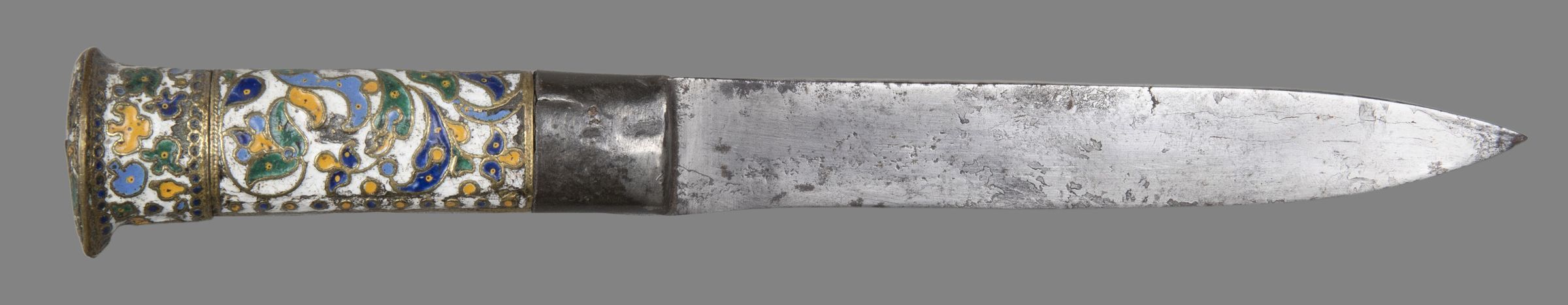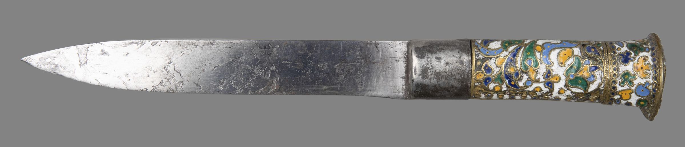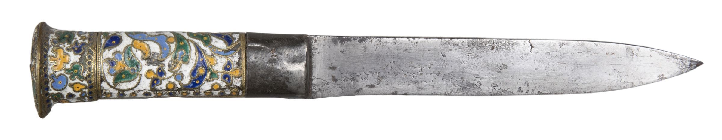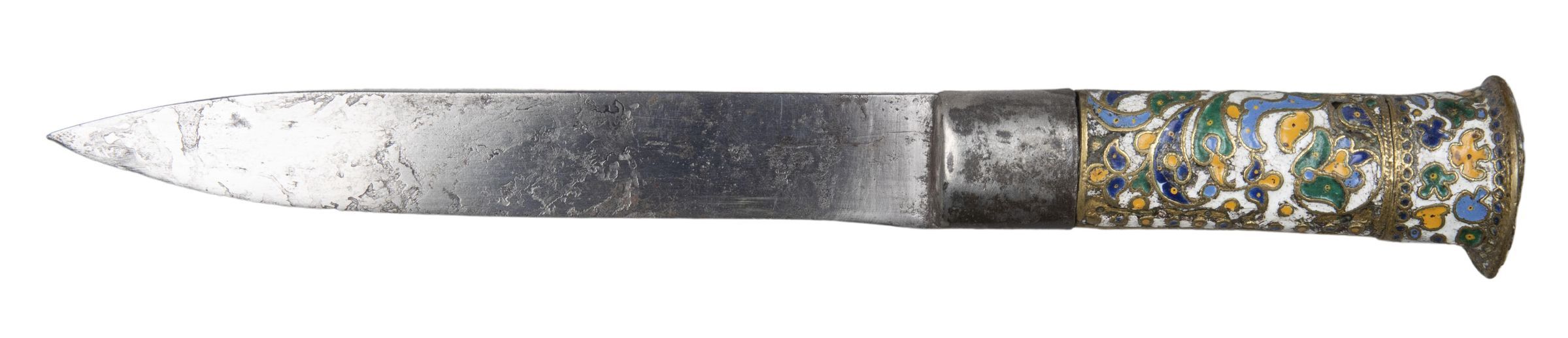 Blade single-edged with leaf-shaped point. Handle of flat, oval section, tapering slightly toward the blade, and with a slightly domed top, bordered by a flange that projects slightly more on the side in line with the edge of the blade; it made in two parts: a steel ferrule 25mm deep, which slightly overlaps the base of the blade; a grip and deep cap-like pommel, cast in brass and covered with a design of foliage and flowers executed in what looks like applied brass wire (as for cloisonne), but apparently cast in one with the base; they are enamelled against a white ground in light and dark blue, green and orange.Collection