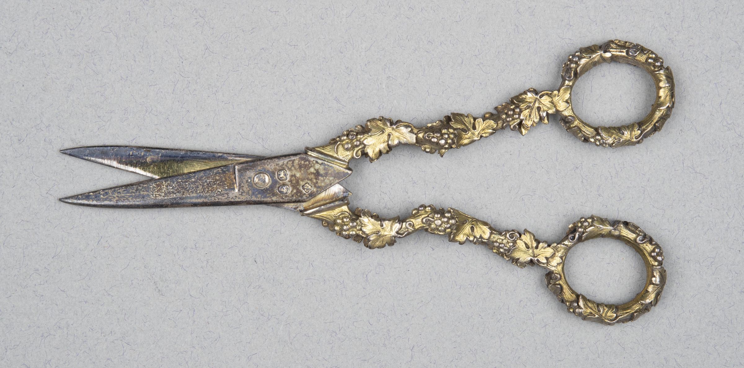 Thick blades chamfered on one side to a straight edge. Backs sloping gently to a point. Neck kinked in a dog-leg, placing handles in a different plane from the blades. Silver-gilt. The handles carved and chased all over with vine leaves and grapes.Collection