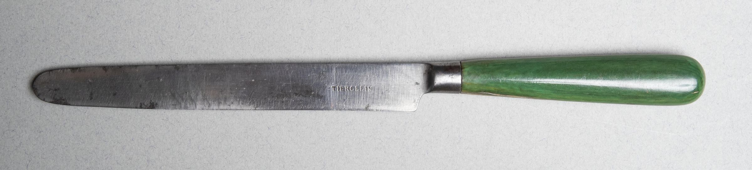 Blade slightly tapering with a single edge, made in one with a plain bolster. Handle of green-stained bone, of flattened oval section with a rounded top.Collection