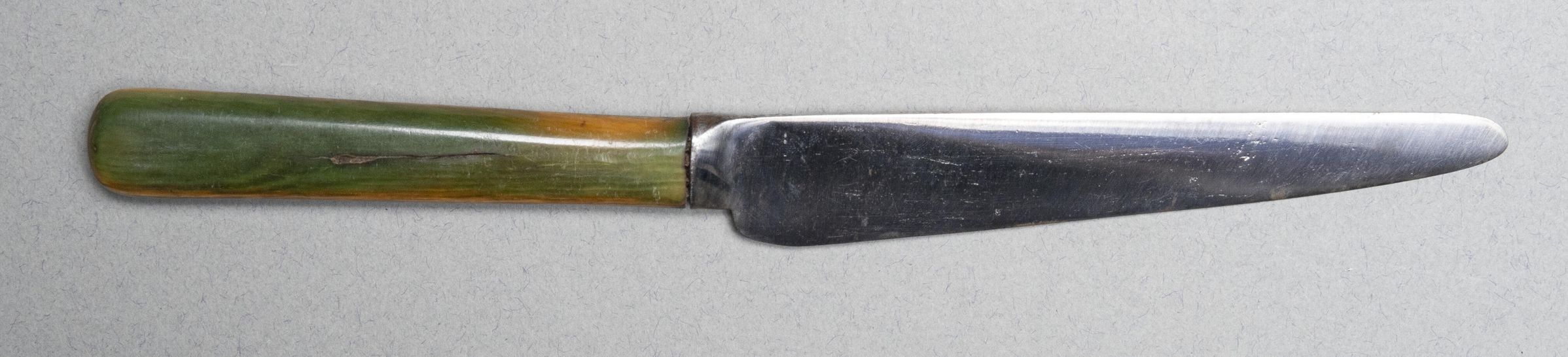 Green stained bone handle, flattened oval in section, flaring slightly to a rounded top.Collection