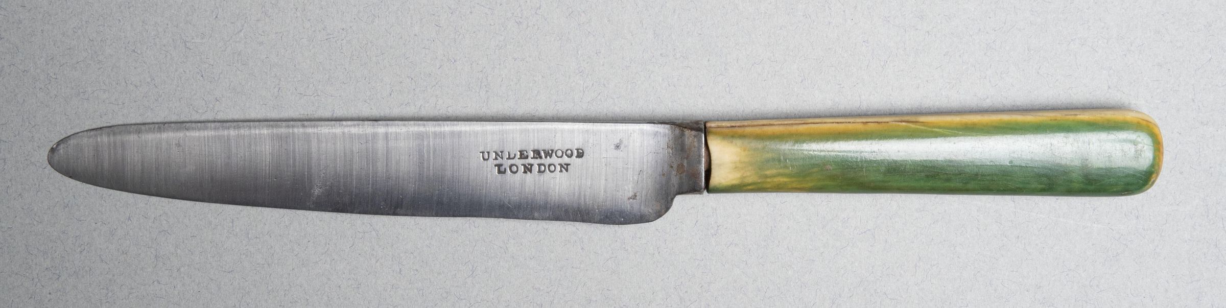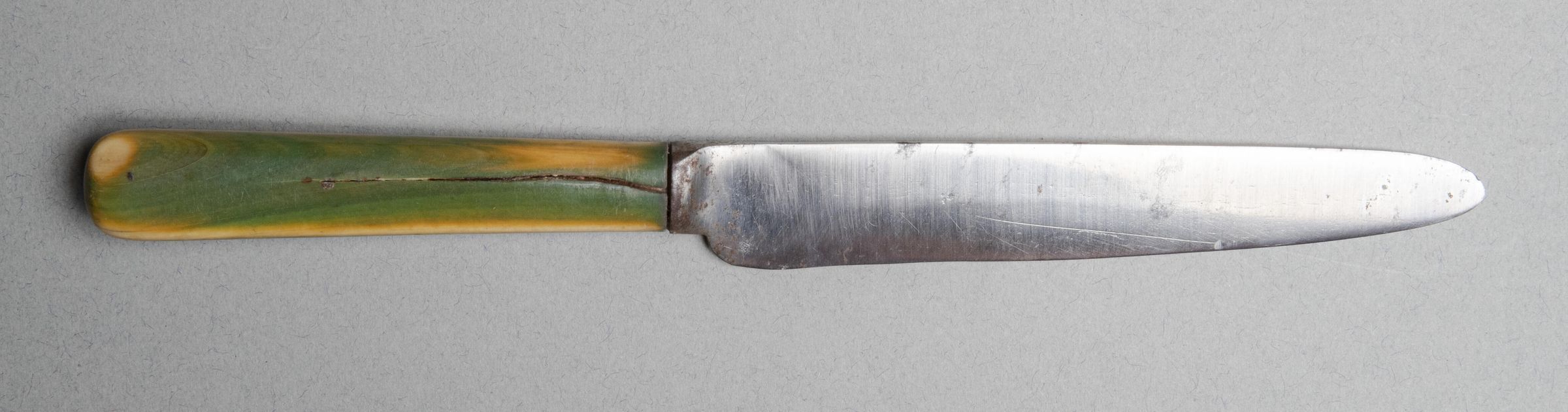 Green stained bone handle, flattened oval in section, flaring slightly to a rounded top.Collection