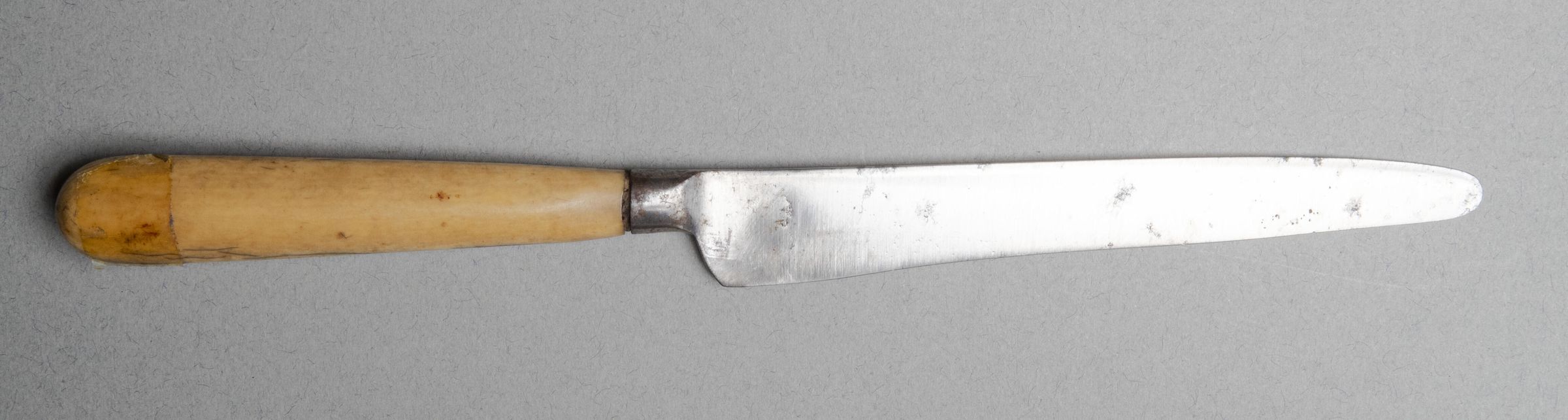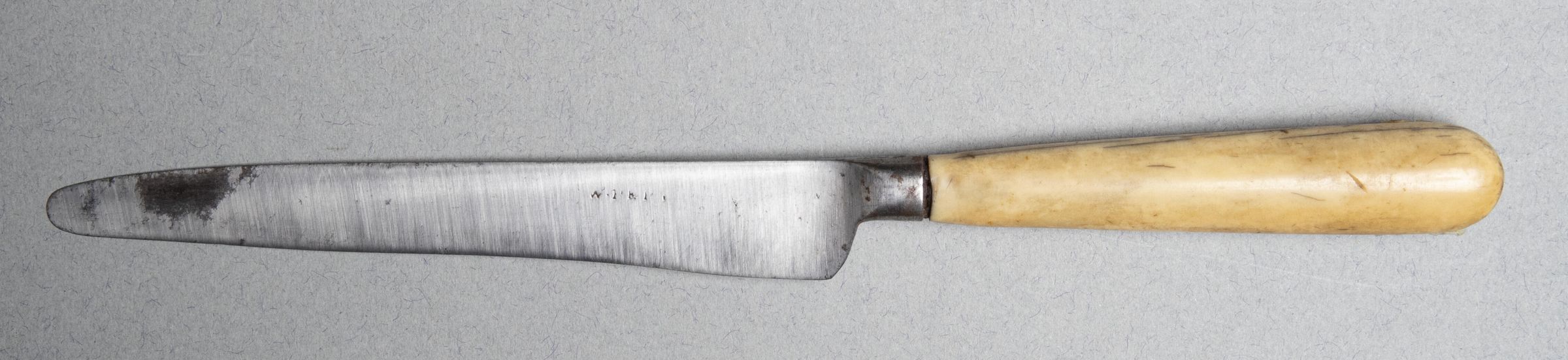 Blade with straight back and edge tapering to a rounded tip with oval section small bolster. Deep curved heel to blade edge, much ground. Natural coloured bone handle of oval section, flaring to a rounded topCollection