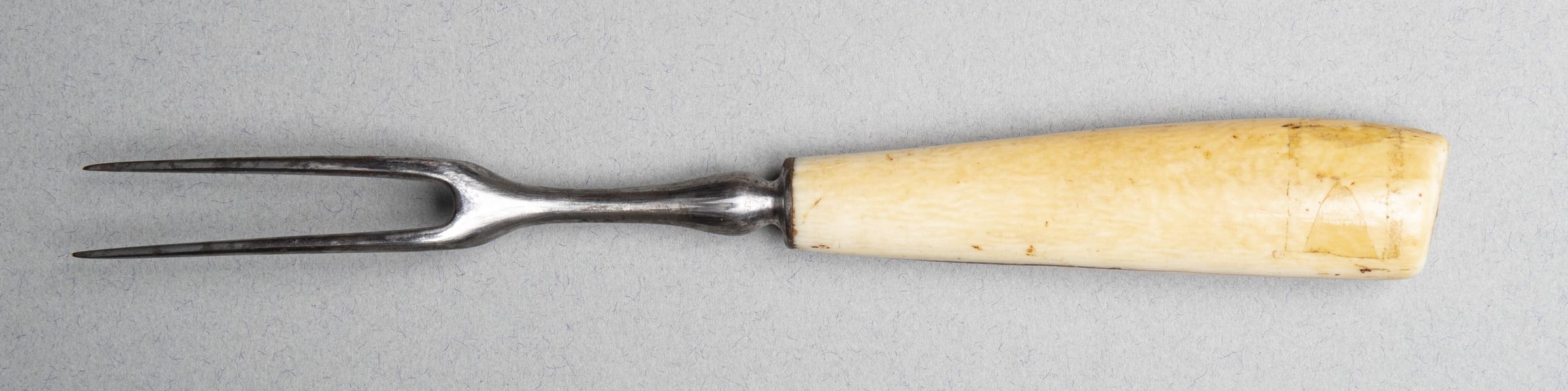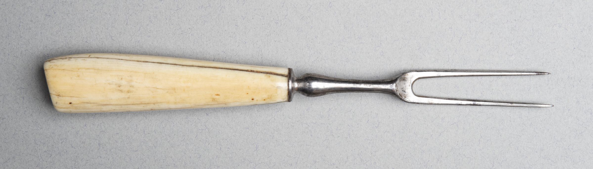 Two slightly curved and flaring tines under rounded concave shoulders. Plain baluster-shaped neck and a flange-shaped baluster.