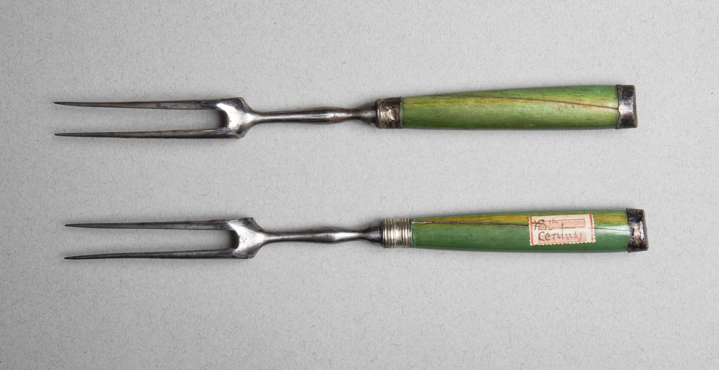 Two curved rectangular tines to a concave rounded shoulder on a long plain baluster-shaped neck ending in a bell-shape below ferrule.