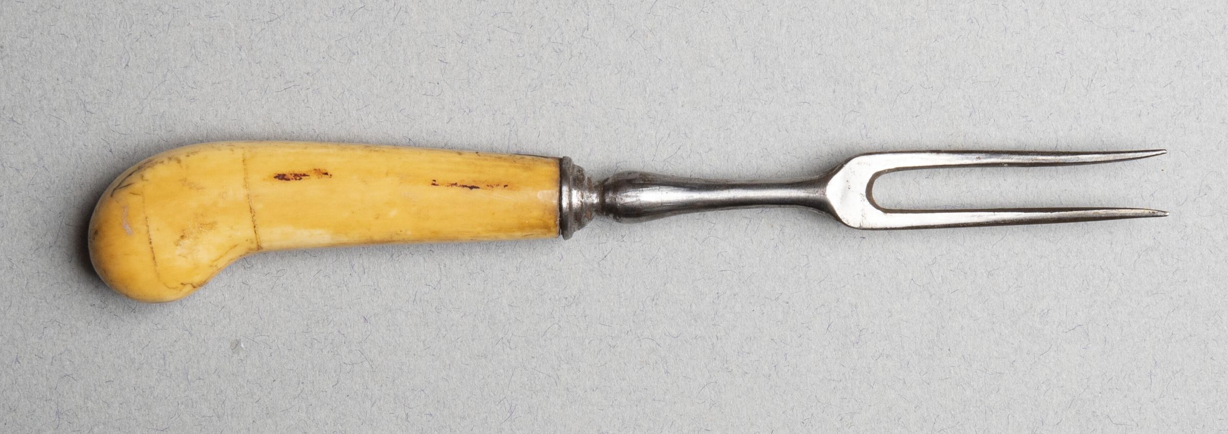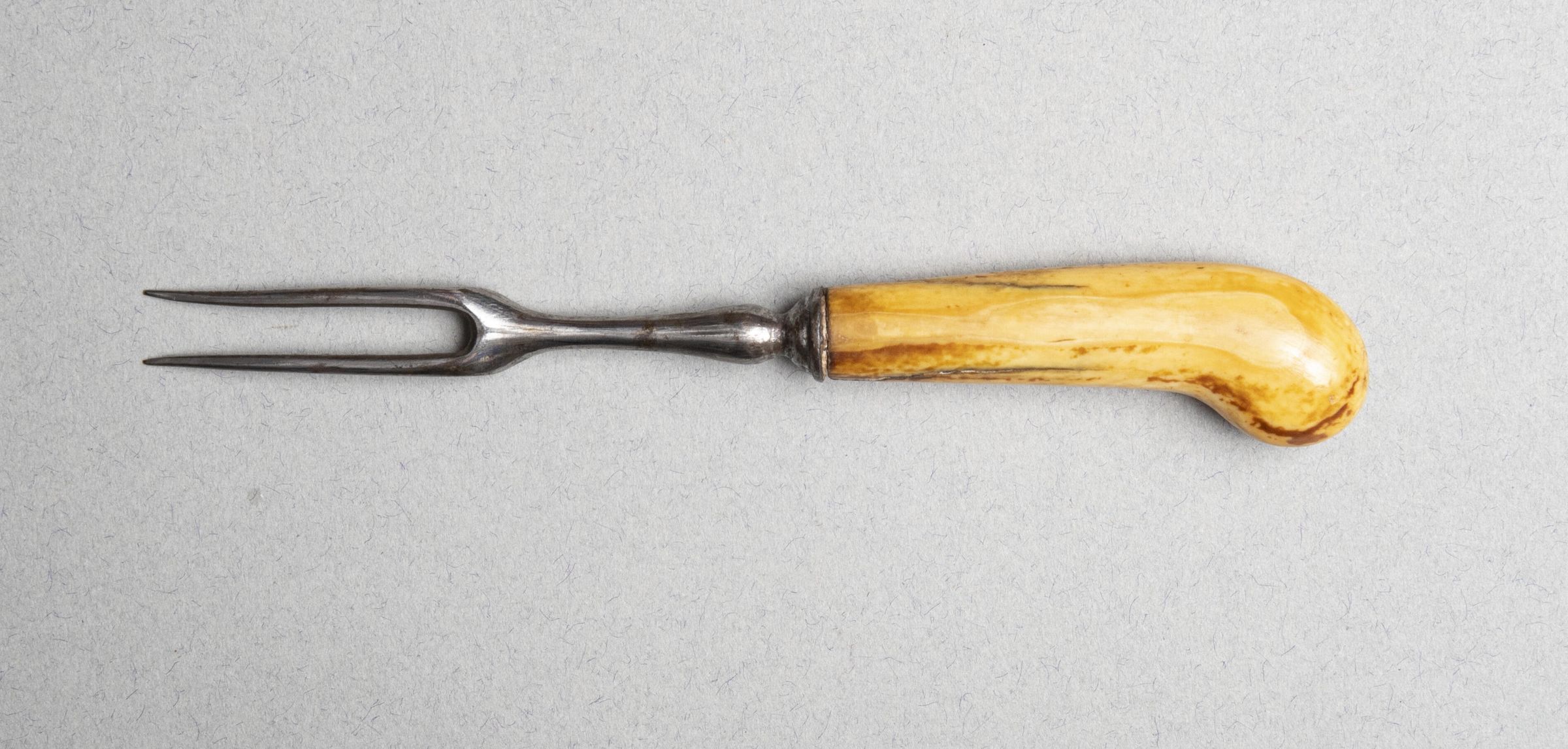 Two curved tines of rectangular section. Plain baluster-shaped neck and banded conical bell/cup shaped bolster.