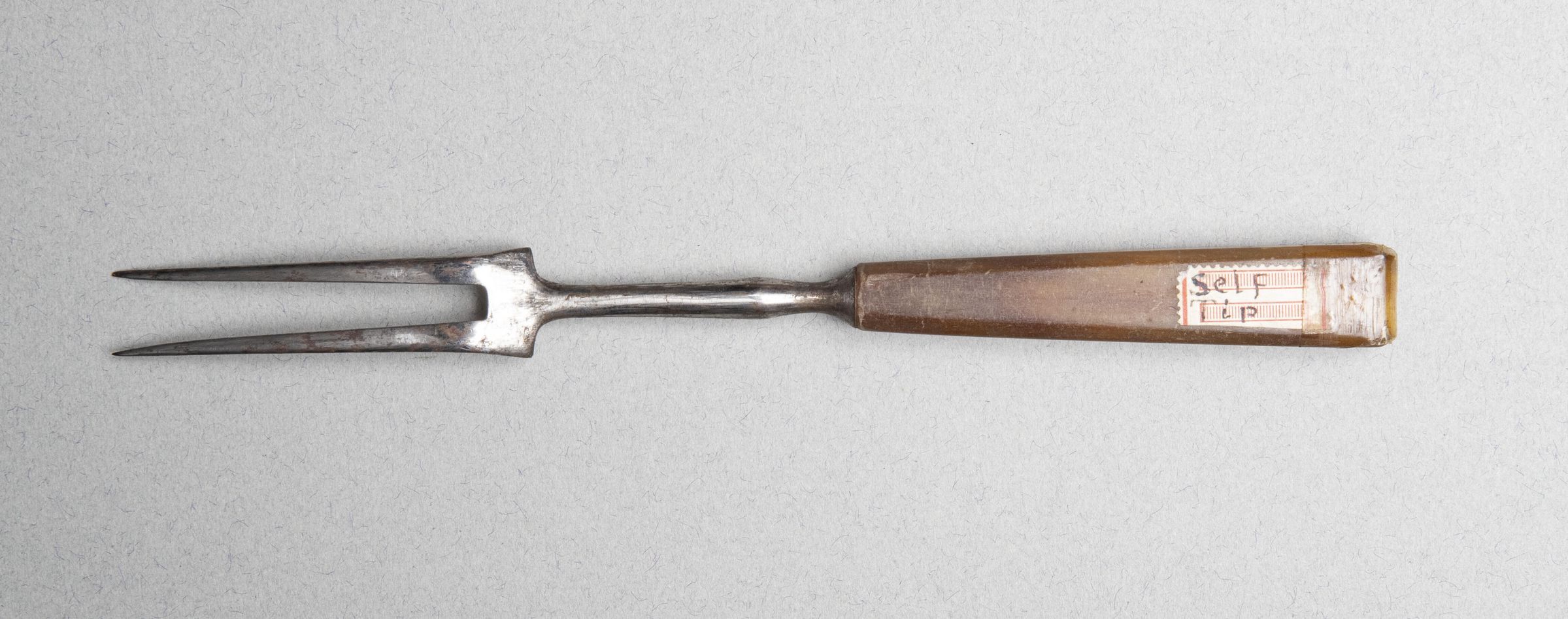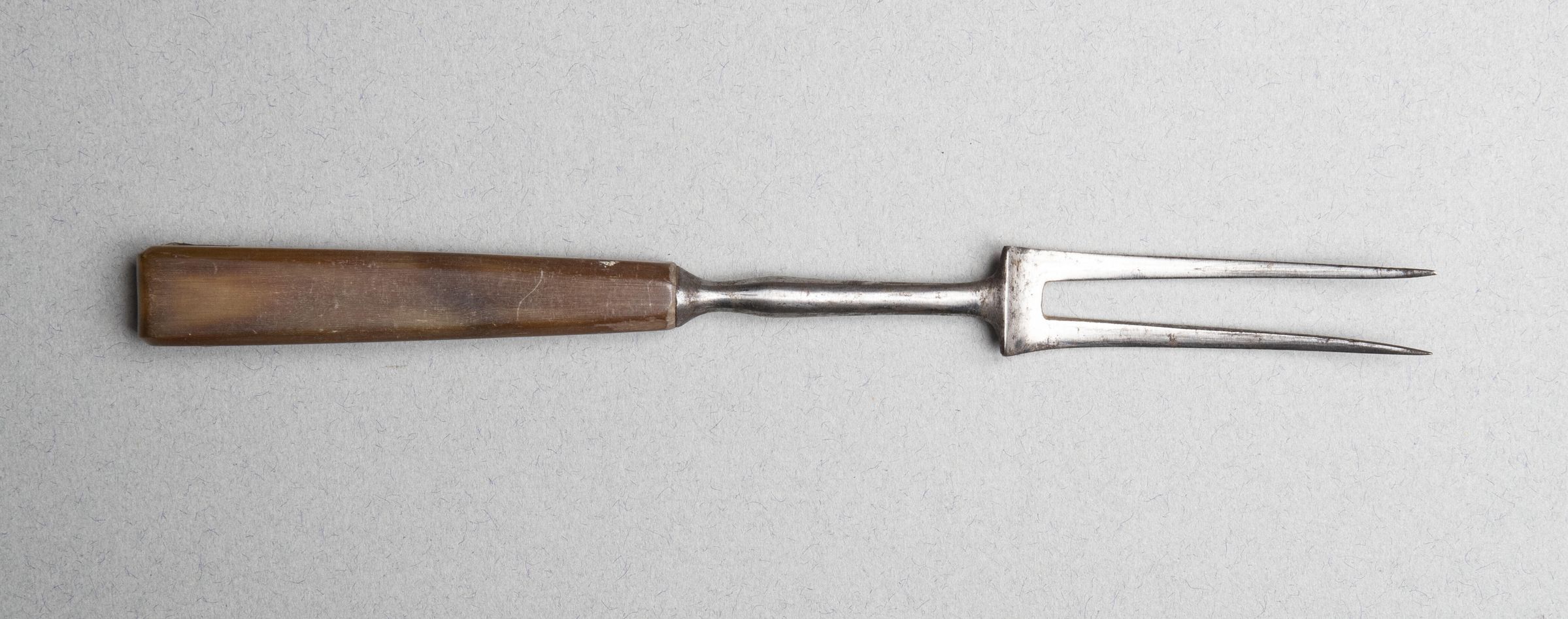 Two curved and slightly flaring tines, rectangular in section above concave square shoulders and slender slightly baluster-shaped neck.