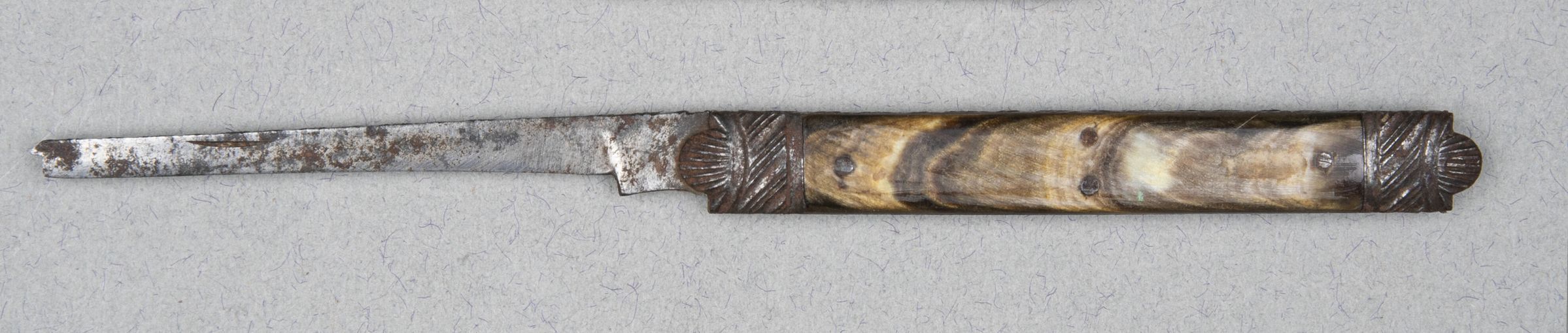Blade end pattern disguises pivotal rivet. Back of blade running along back edge of handle, decorated by diagonal bands of alternatively plain and beaded decoration.Collection