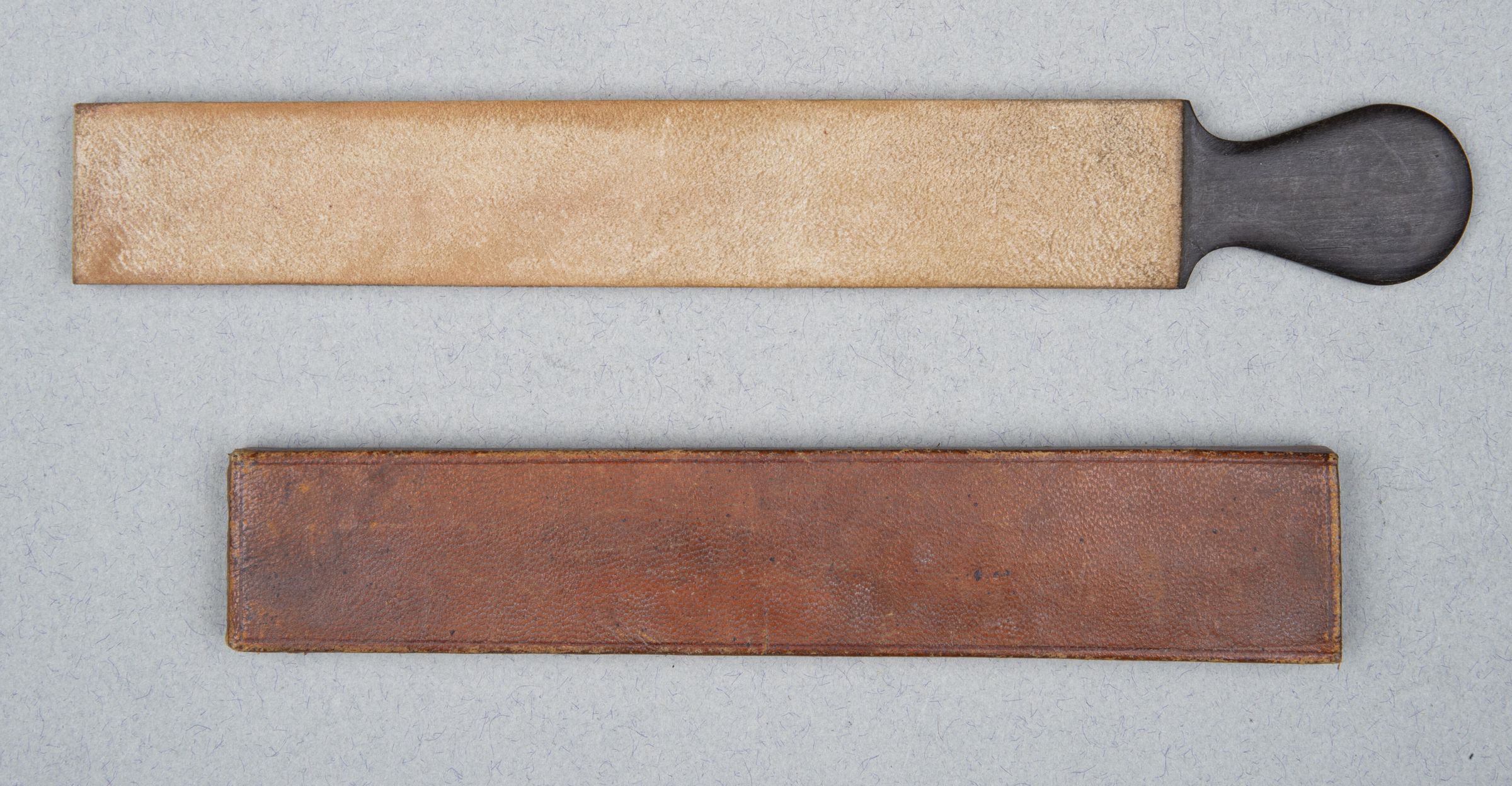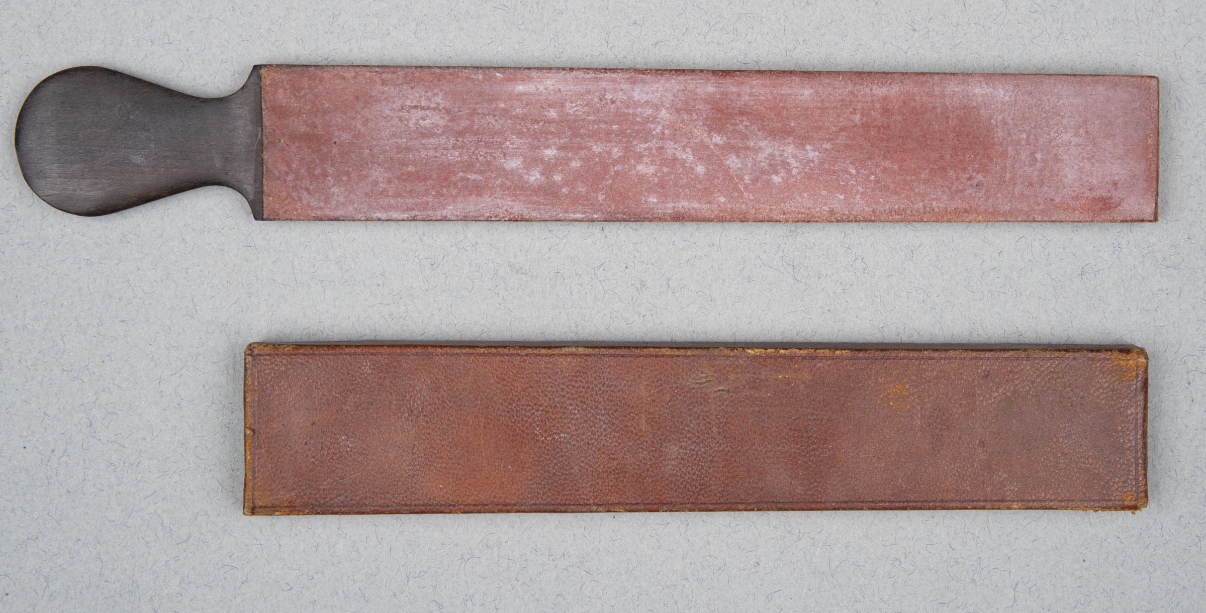 419.01 Strop: Flat strip of mahogany faced on both sides with leather. One side red and hard, the other yellow suede (?). Possibly a surgical strop.