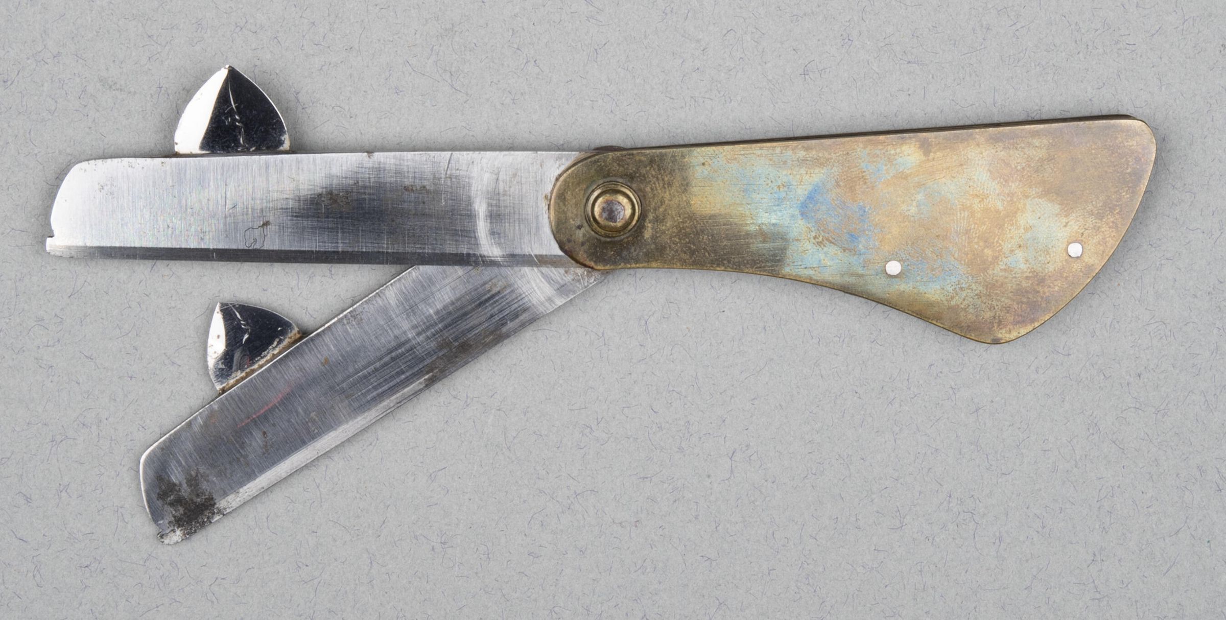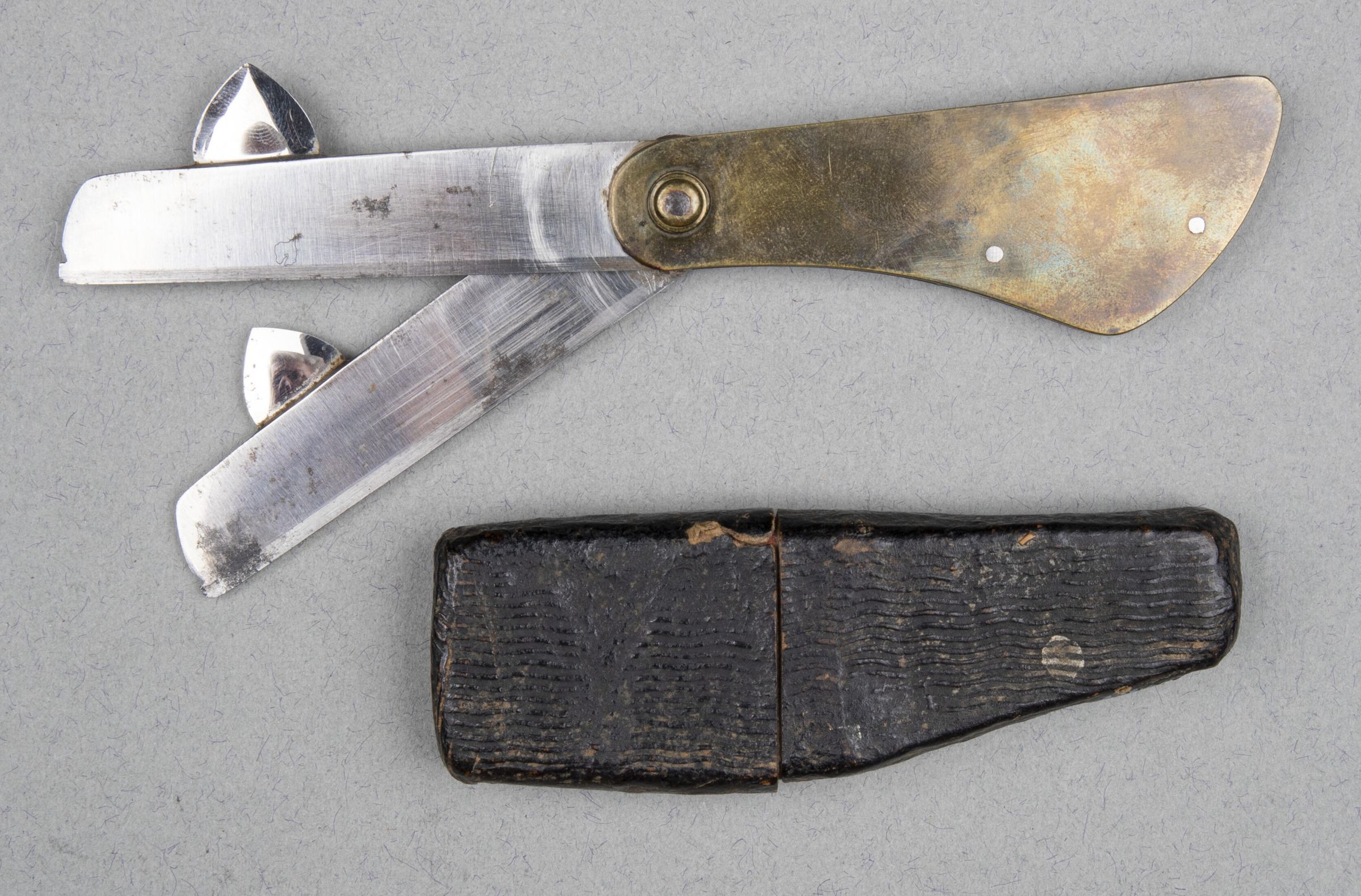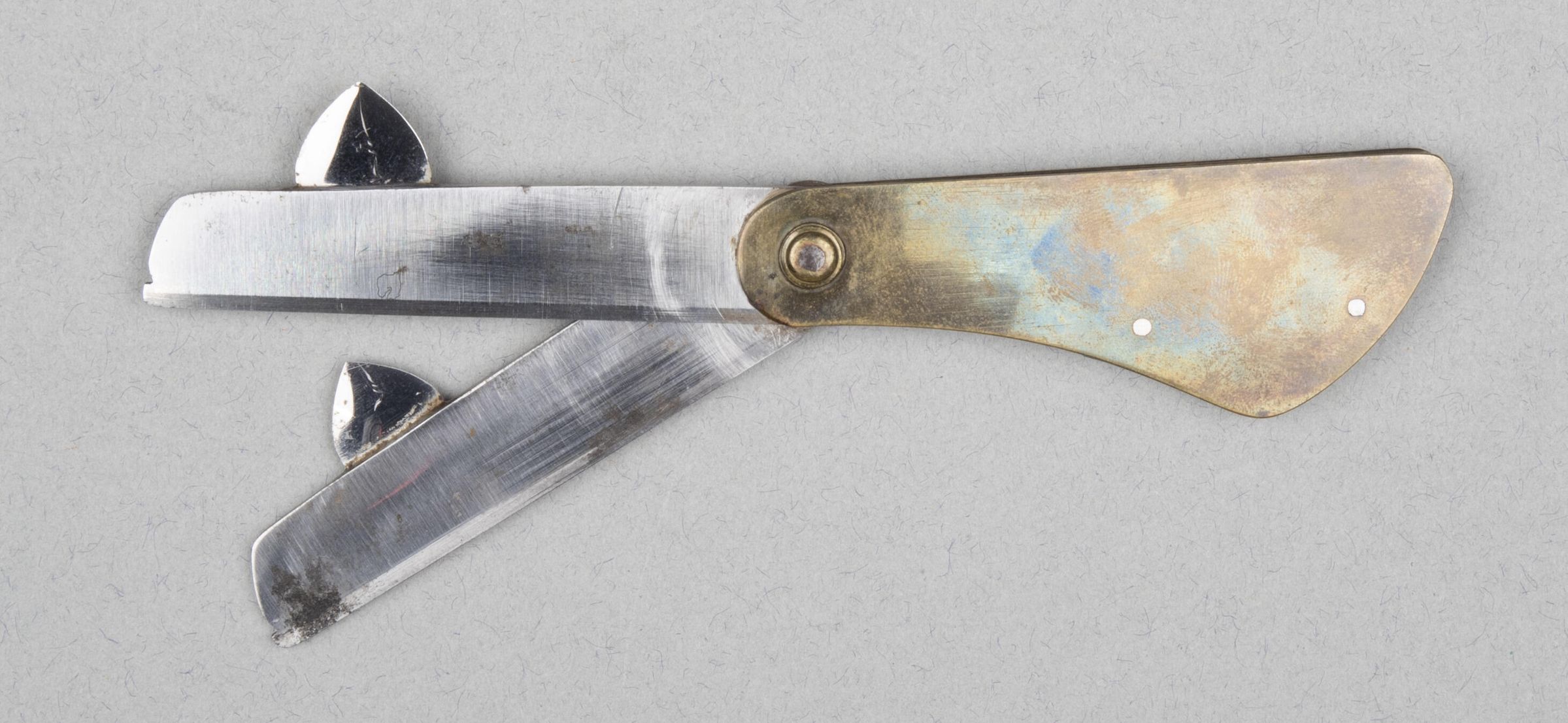 430.01 Fleam: Two blades of traditional form that hinge out from a brass cover. One blade smaller than the other.