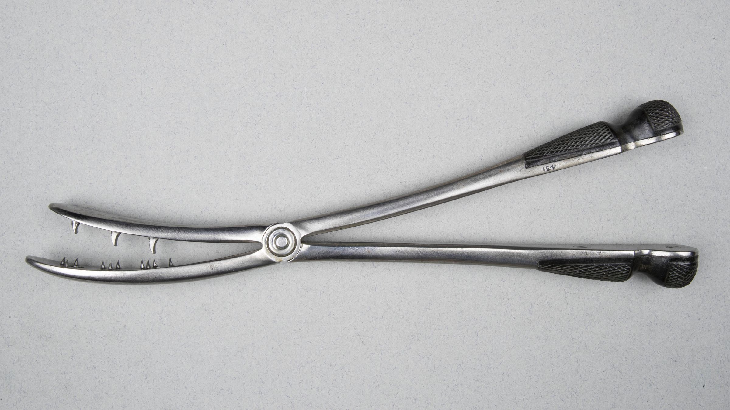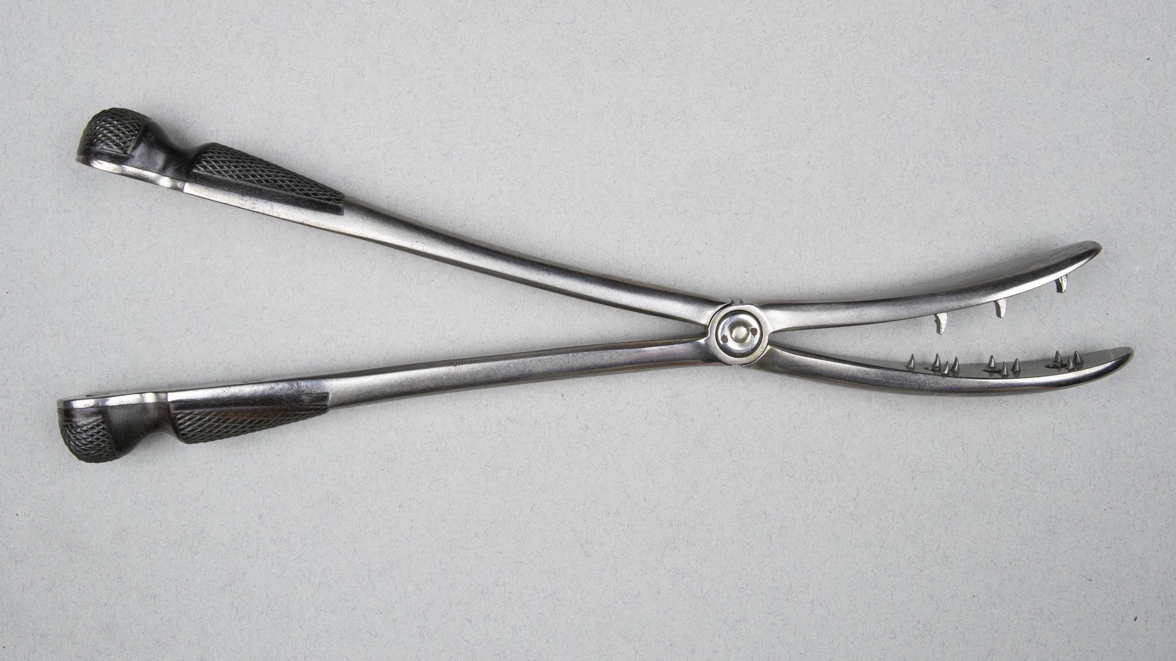Steel. Hinged forceps with ebony insert at ends of each handle to form grip. Jaws have backward curving spikes on inner faces which enter perforation or pits in opening jaws.Collection