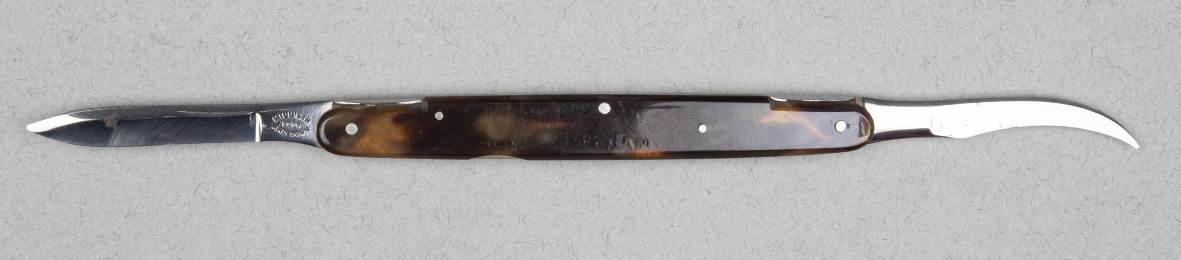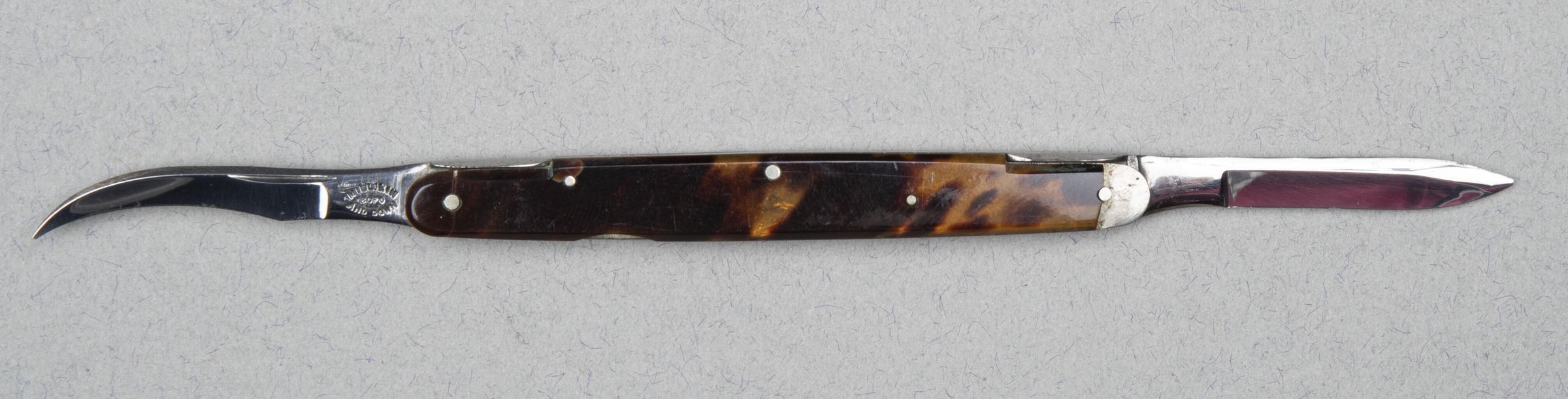 Folding into a penknife (pocket) knife-like back with tortoiseshell scales. Each has a spring-clip to fasten firmly into position.Collection