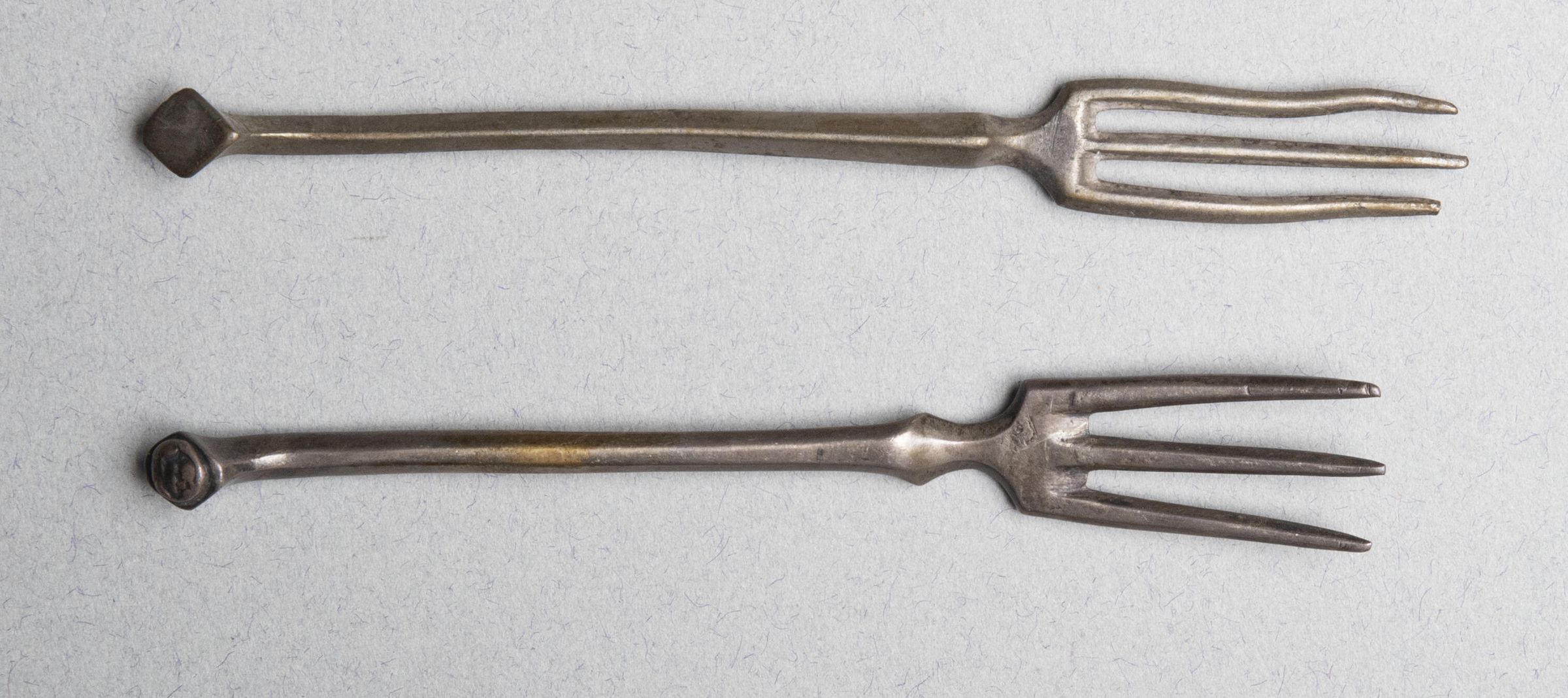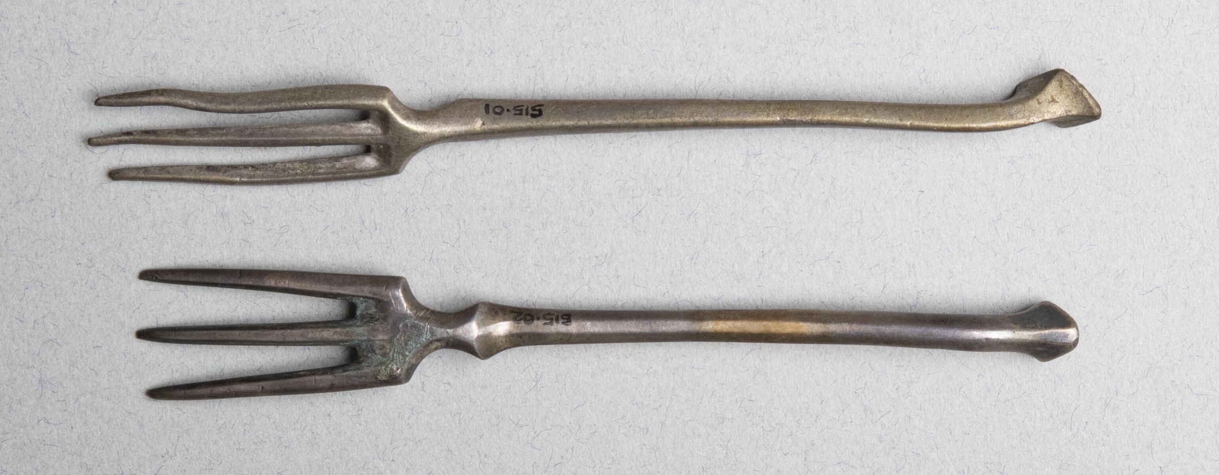 515.02 Fork: Three tines, crudely cast. Handle integral with head. Semi-diamond finial with a face cast in it (top item in photograph).Collection
