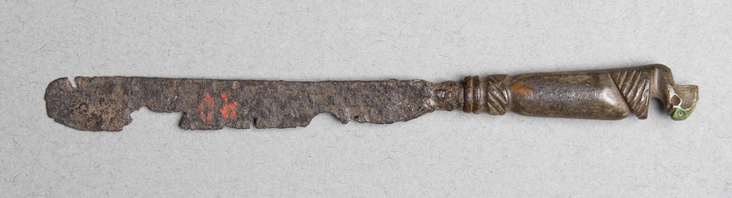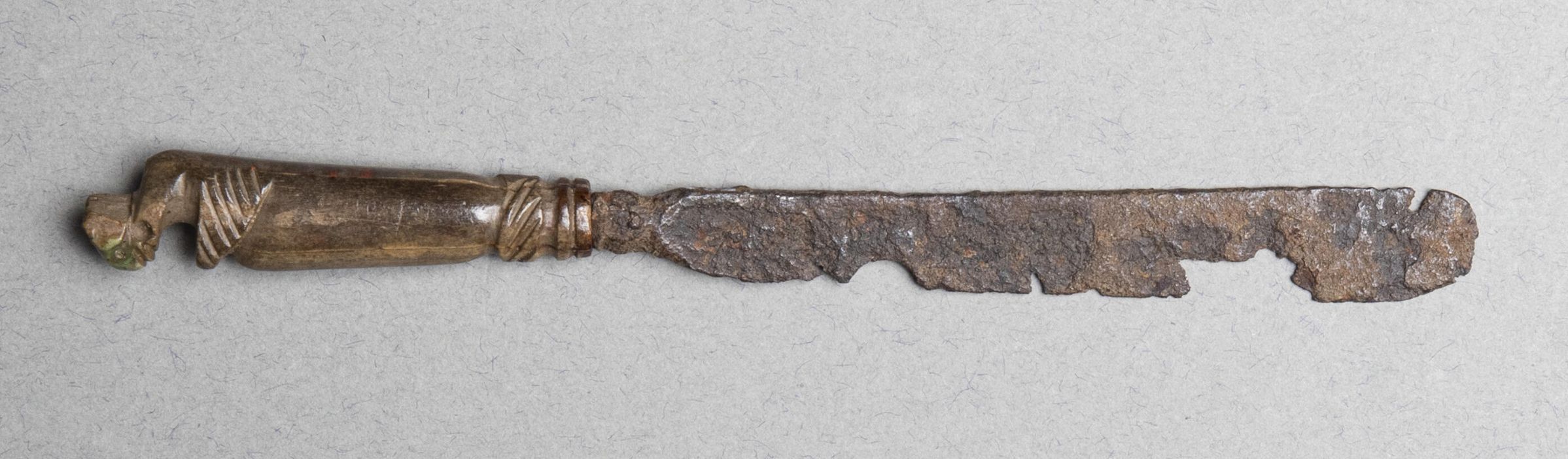 Blade of wrought iron with rounded tip, heavily corroded.