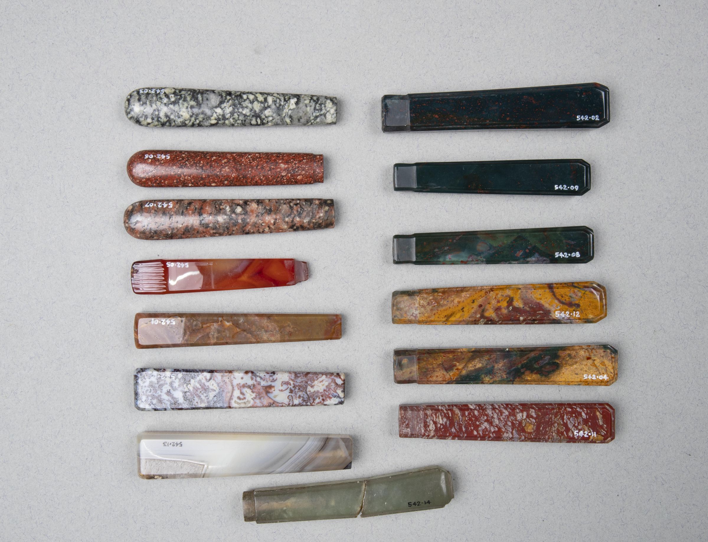542.05: Flat section with incised lines at proximal end. Agate?