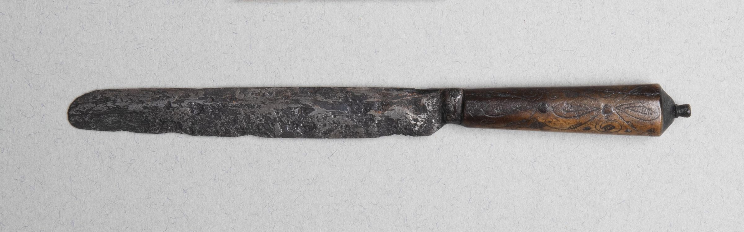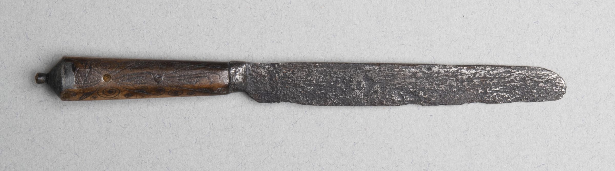 Haft of ivory engraved with scrollwork and inlaid with amber rosettes. Some restoration to end of haft.Collection