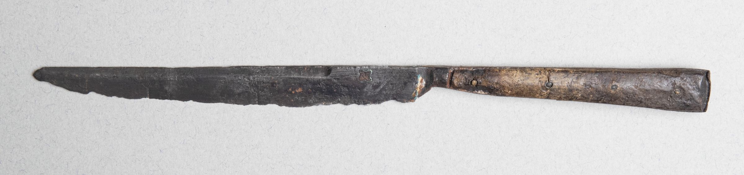 Blade repaired. Long swage, small bolster. Handle with dudgeon scales.Collection
