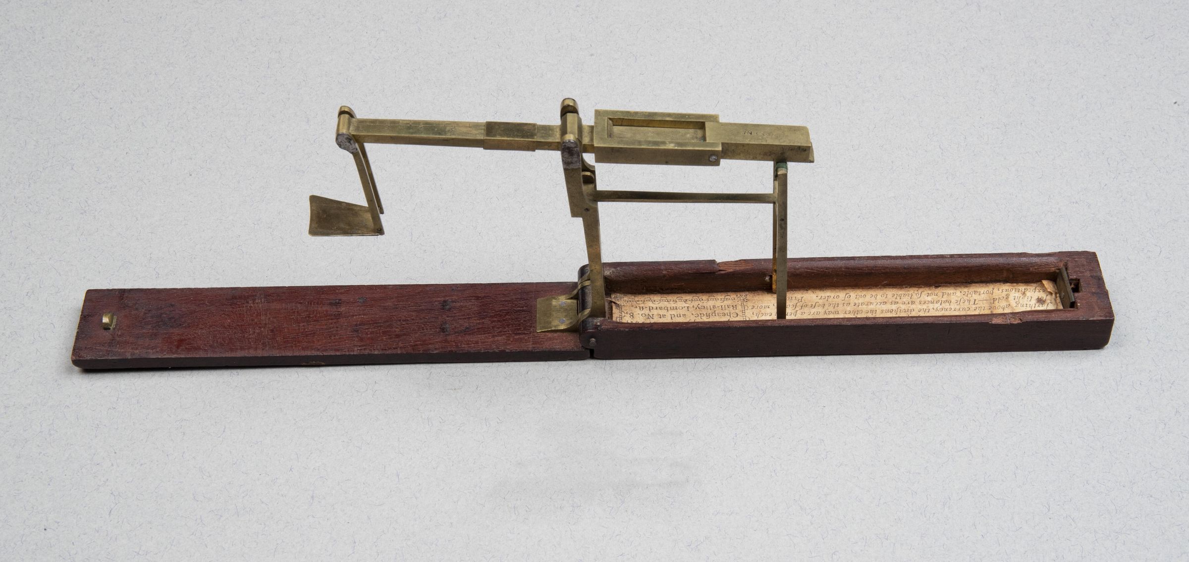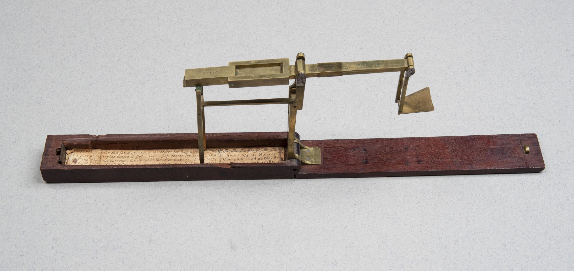 Brass folding balance for guinea and half-guinea, mounted in wooden case with hinged lid. The balance self-erects when the lid is opened.Collection