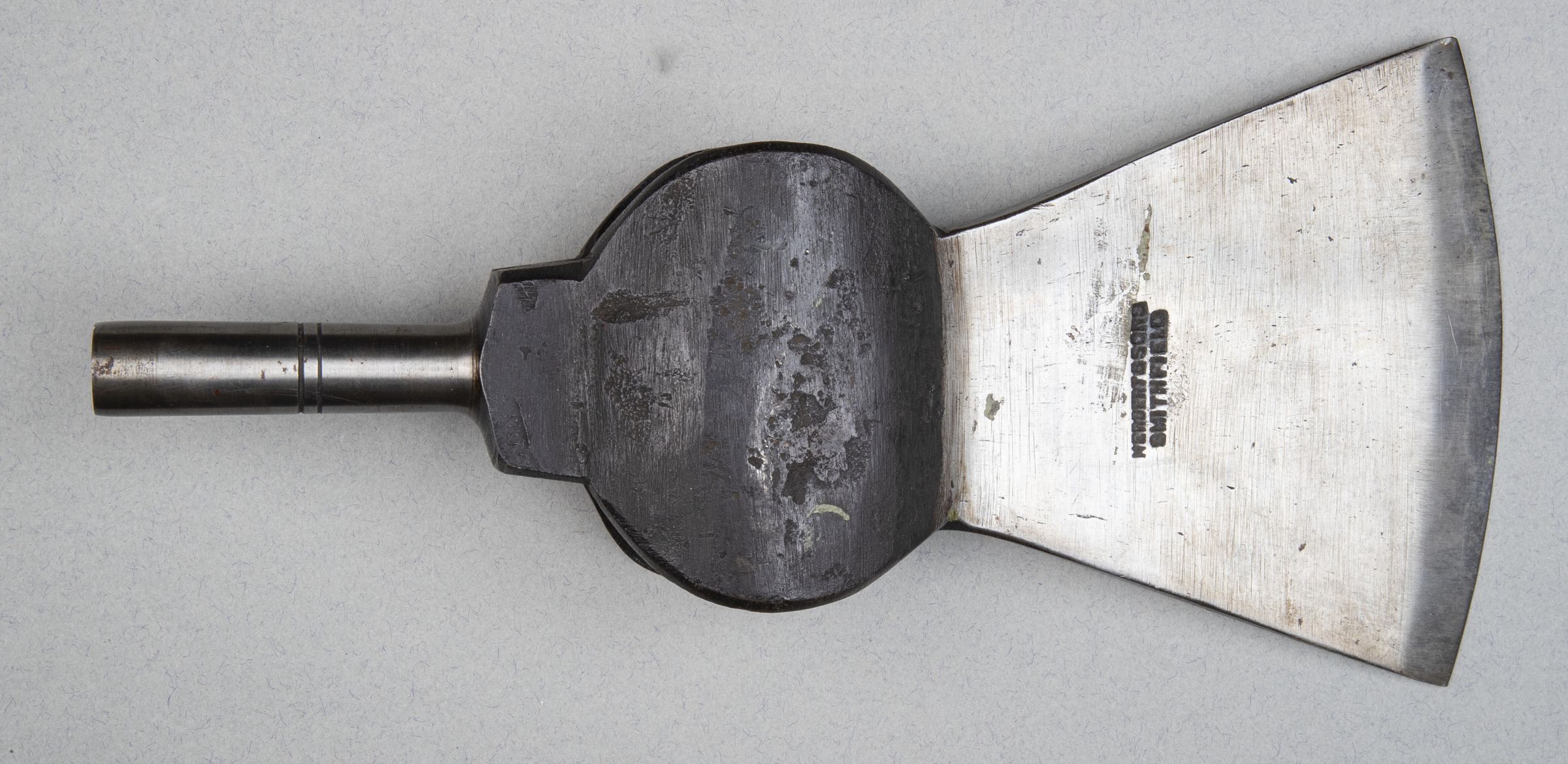 Axe head of standard form with protruding medal tube at its back. The tube has a sharpened, cutting, edge and a perforation on one side.Collection