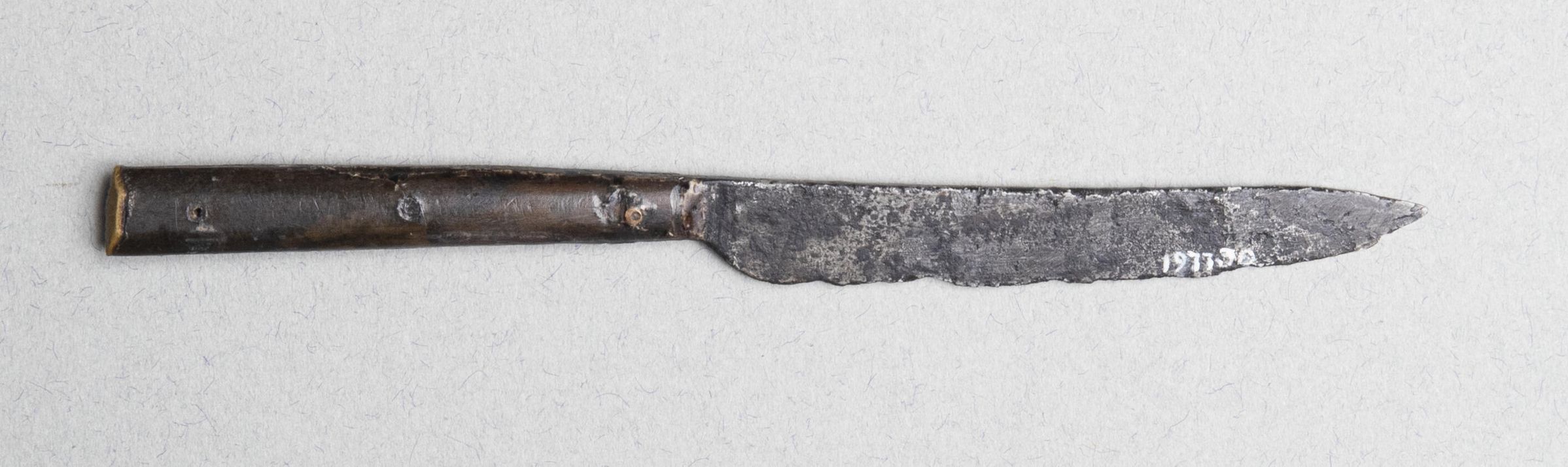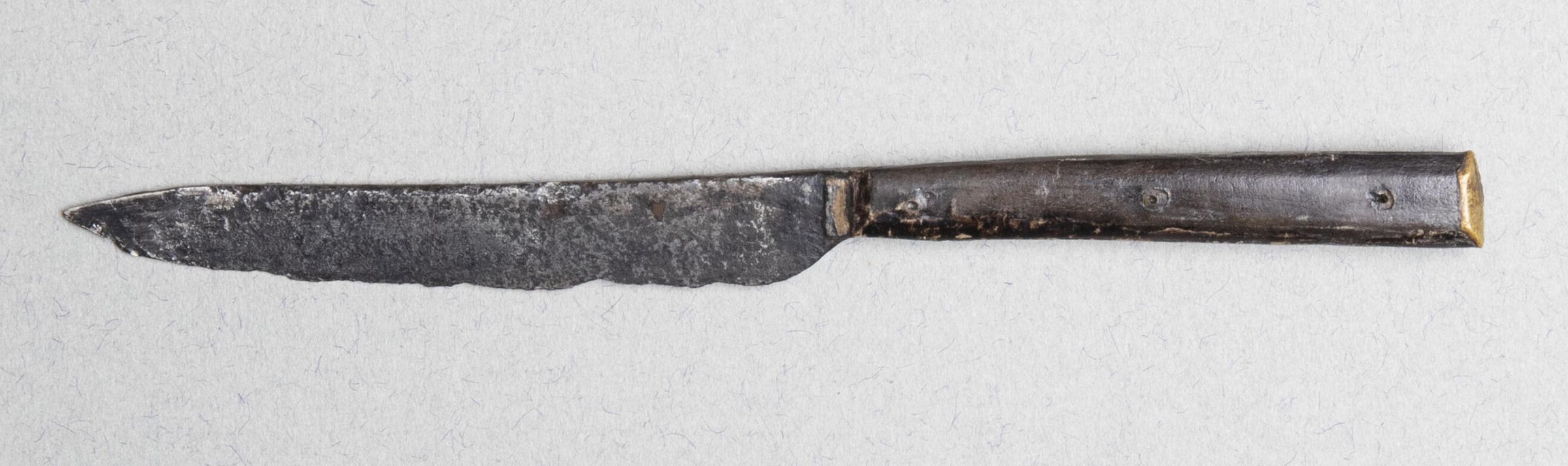 Blade has straight back to point. Haft of bone scales held by three brass rivets and brass tang plate.Collection