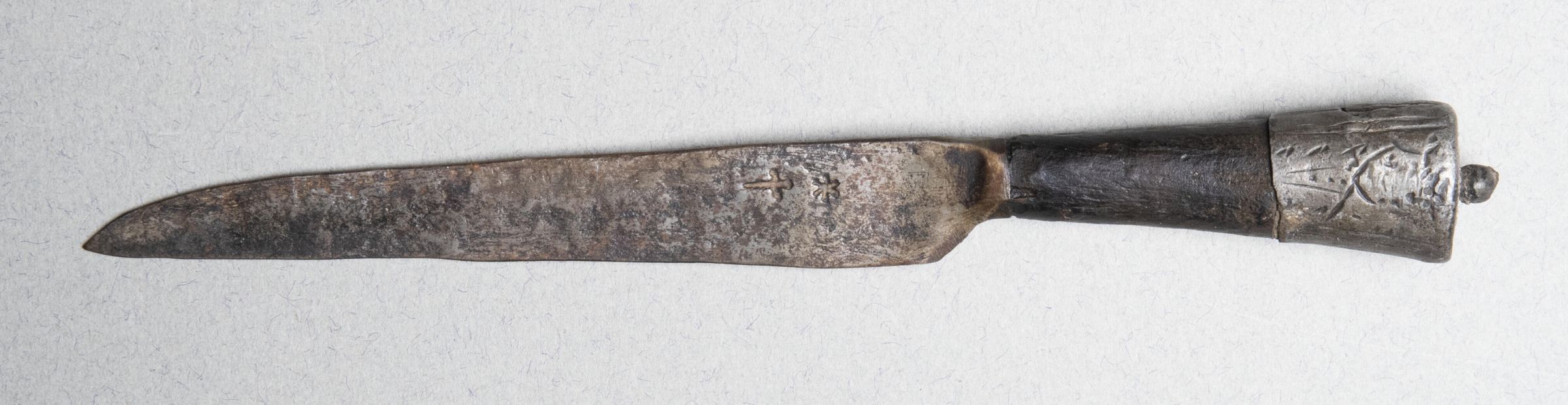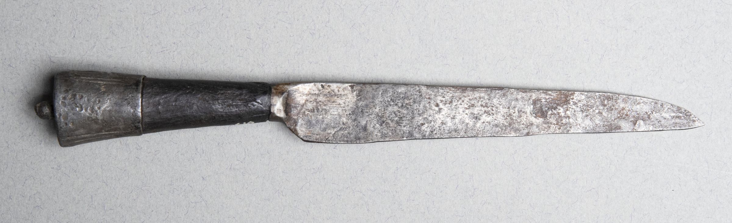 Through tanged blade, the back of the blade tapering to the point and having a simple integral bolster. Handle of wood with pewter end cap decorated with incised lines and dots. Tang secured by a small round pewter pommel.Collection
