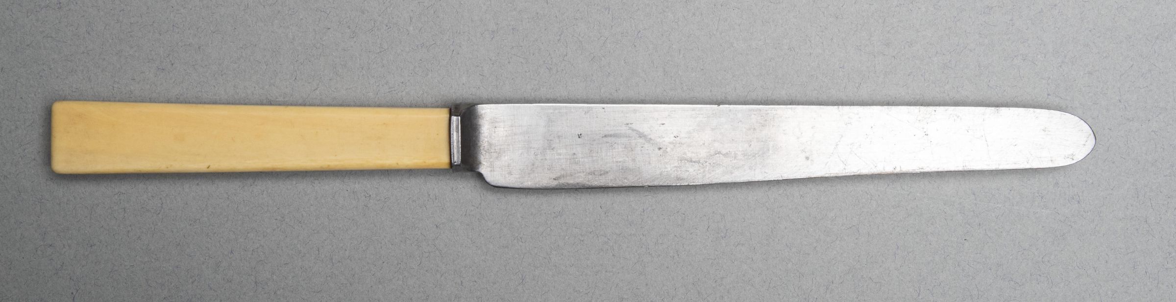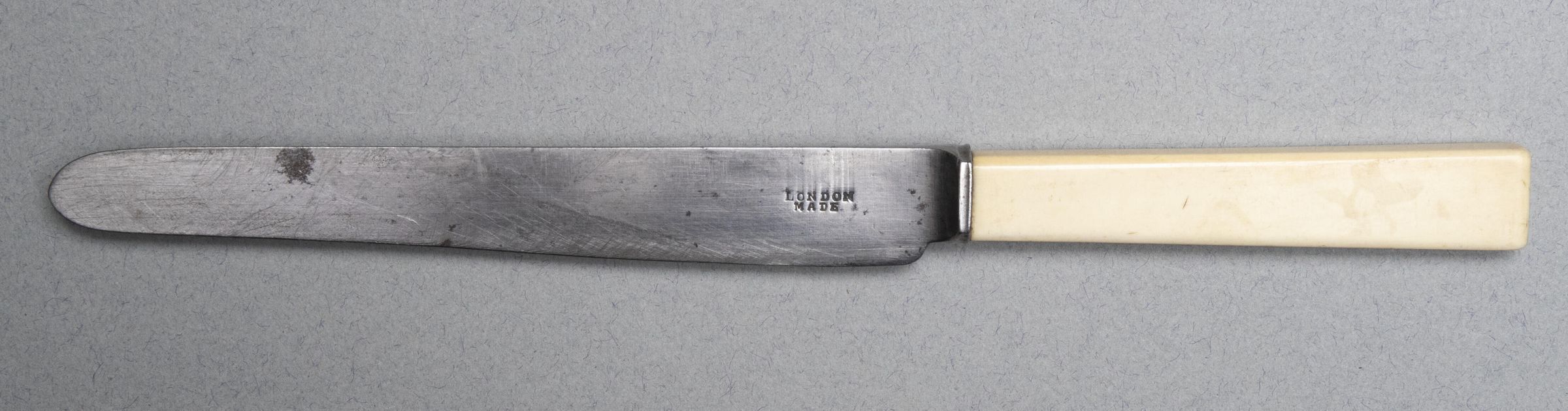 Blade of steel with parallel sides and round tip, 'thumb mark' of weld to tang, and bone handle. The blade is somewhat wasted due to sharpening.Collection