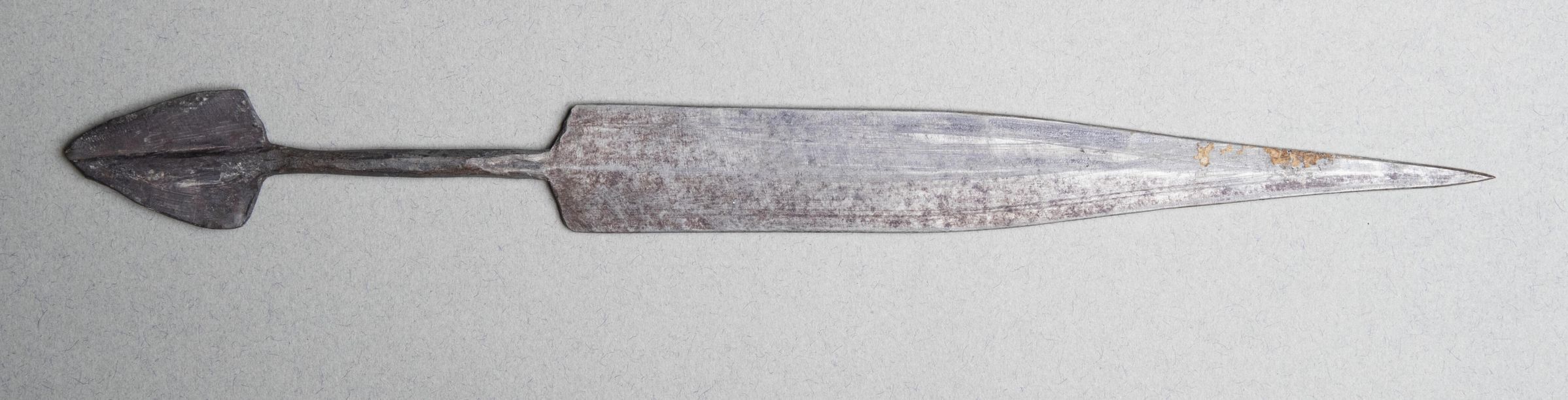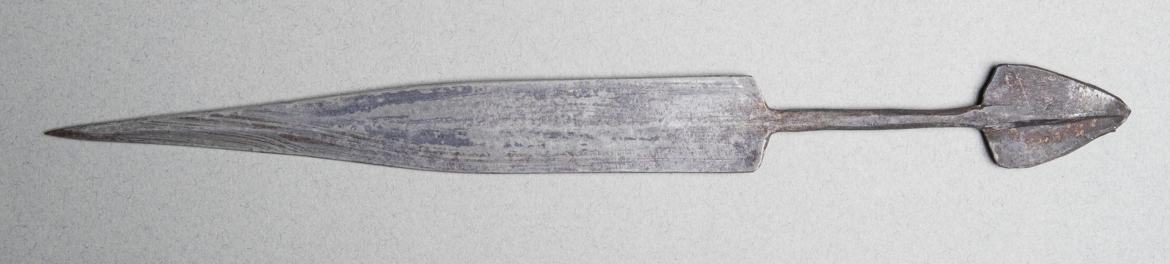Iron blade with parallel sides and tapering to a sharp point. Narrow tang and flattened arrowhead-shaped terminal. The edges are not sharpened. This is a blade as it left the hands of the blacksmith / bladesmith before work by the sheather and handle-maker.Collection