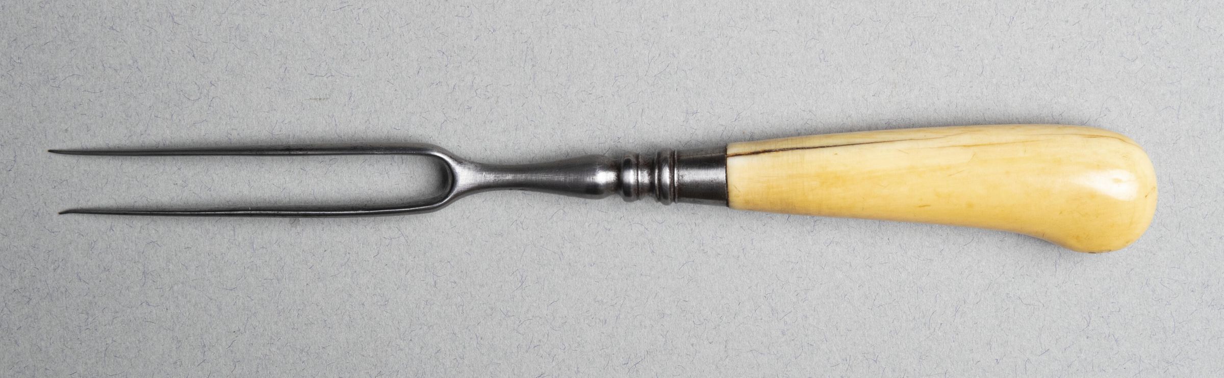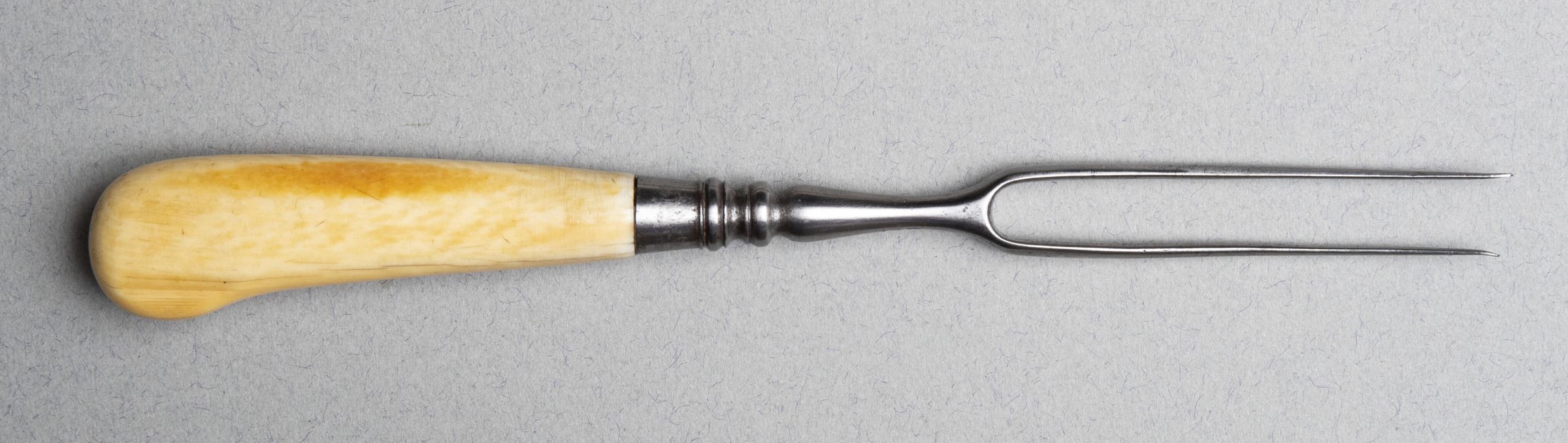 With two long, slightly curved tines and waisted neck. The flaring ivory handle, a flattened oval in section, is carved with rustic texture. The cap and ferrule of silver.Collection