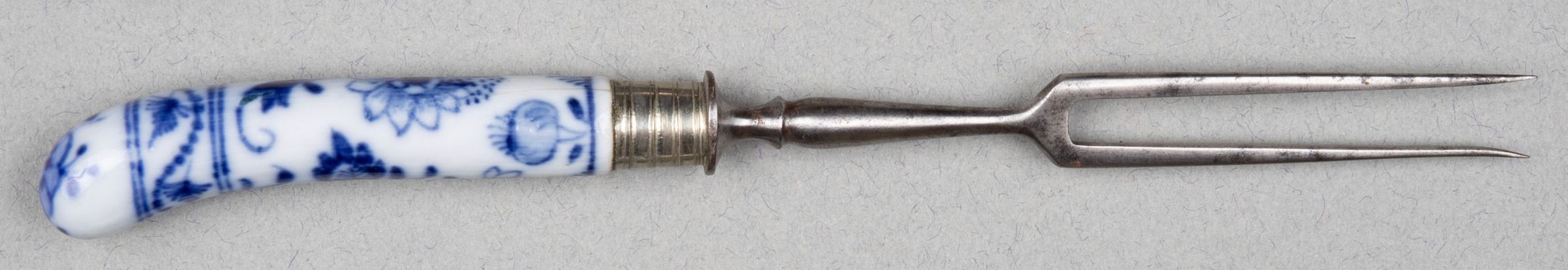 Two long straight tines and waisted neck. Pistol-shaped handle of blue and white Meissen porcelain with banded silver ferrules.Collection