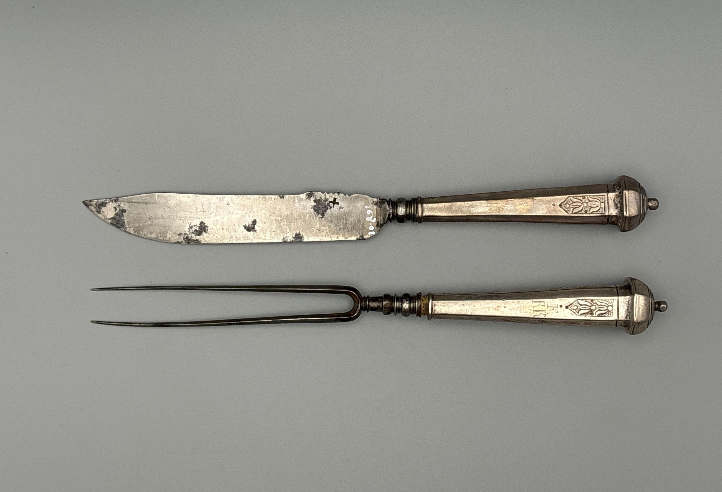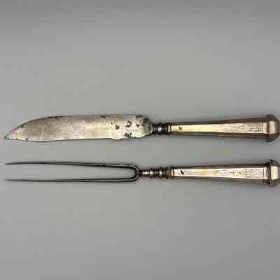 Table knife fork, 2 tines, engraved initials TIS, European silverCollection