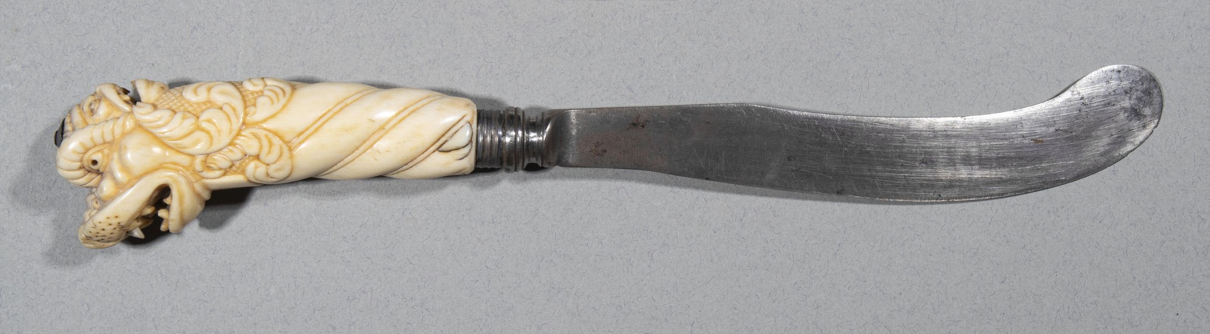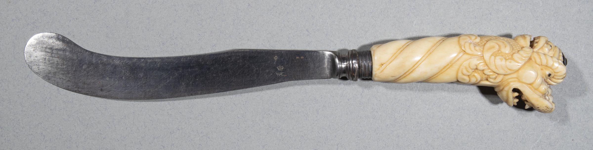 Sabre-shaped blade with waisted bolster. The pistol-shaped ivory handle carved as a monster with open mouth, a subsidiary head on the back, acanthus leaves and scrolling and spiral flutes. Horizontally fluted silver ferrule with tang washer.Collection