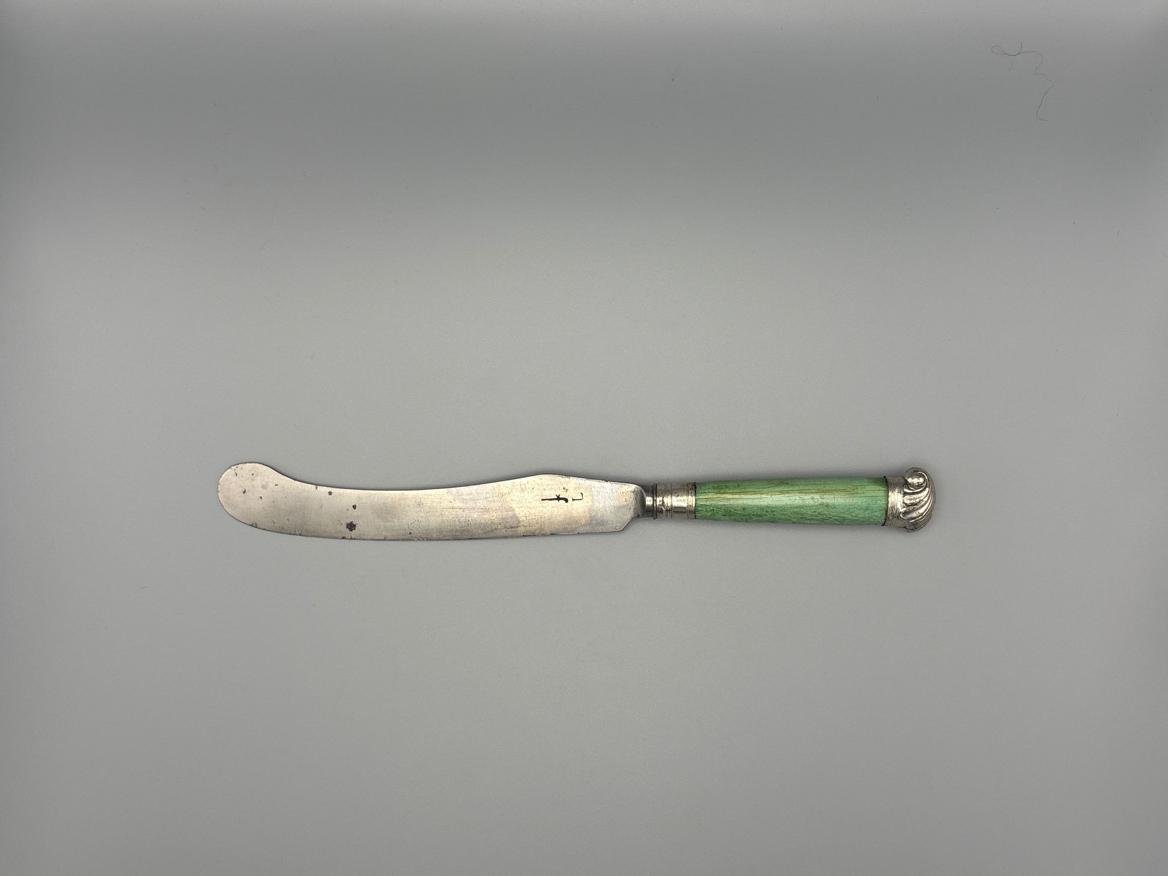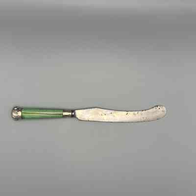 Sabre-shaped blade, plain bolster. The handle of green-stained ivory with a banded silver ferrule and silver shell-and-band cap.Collection