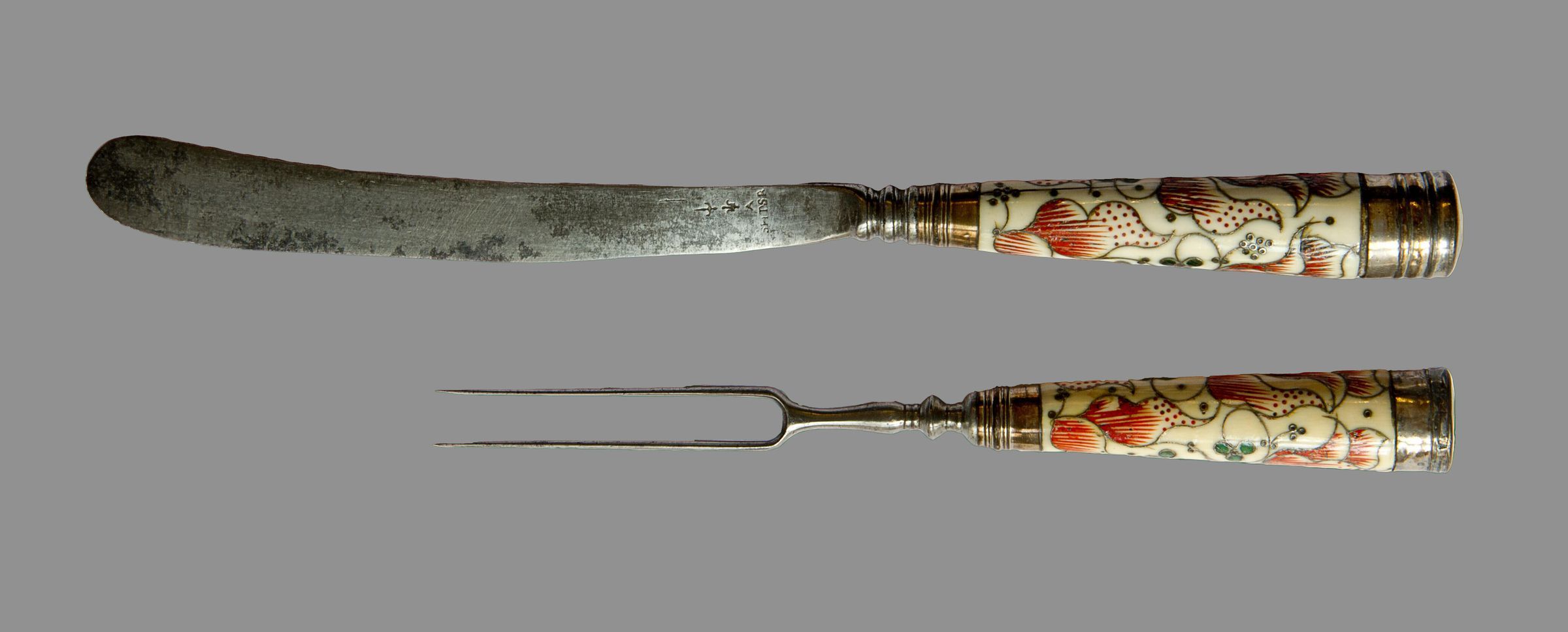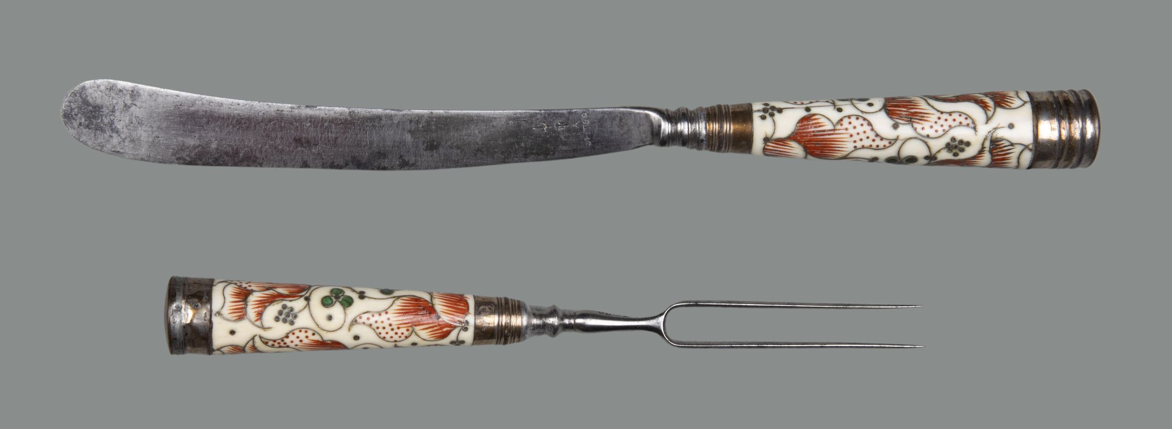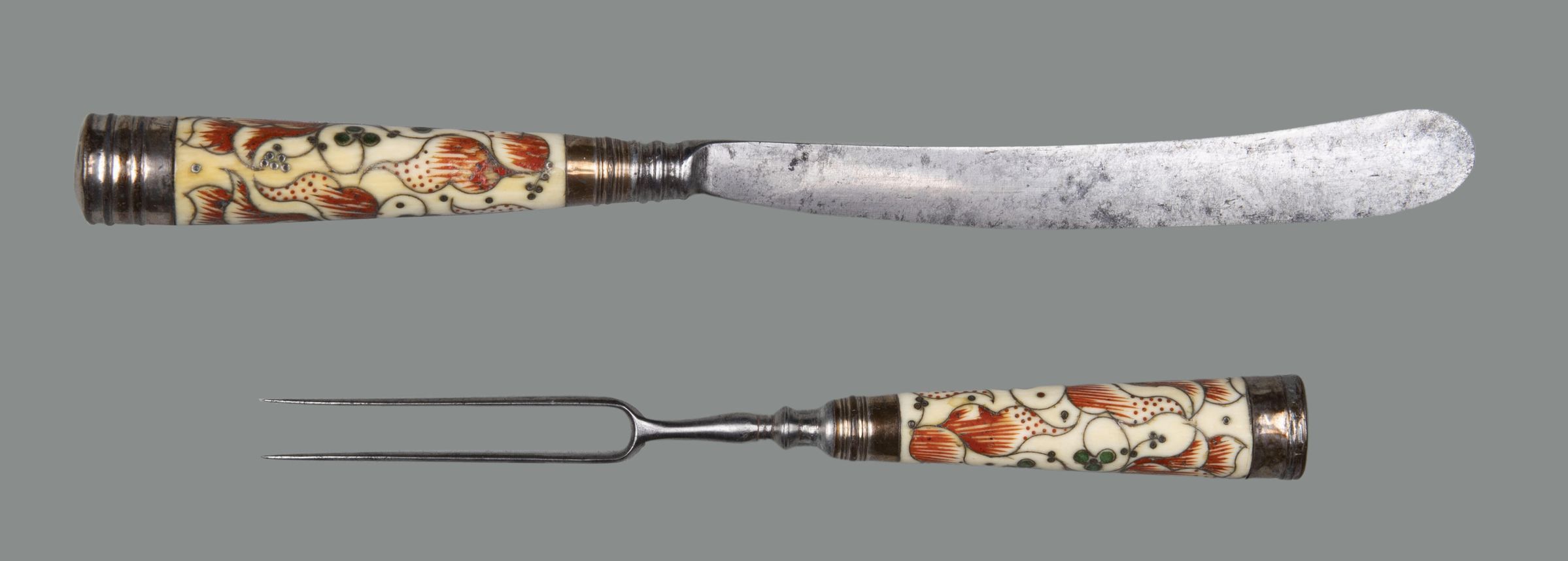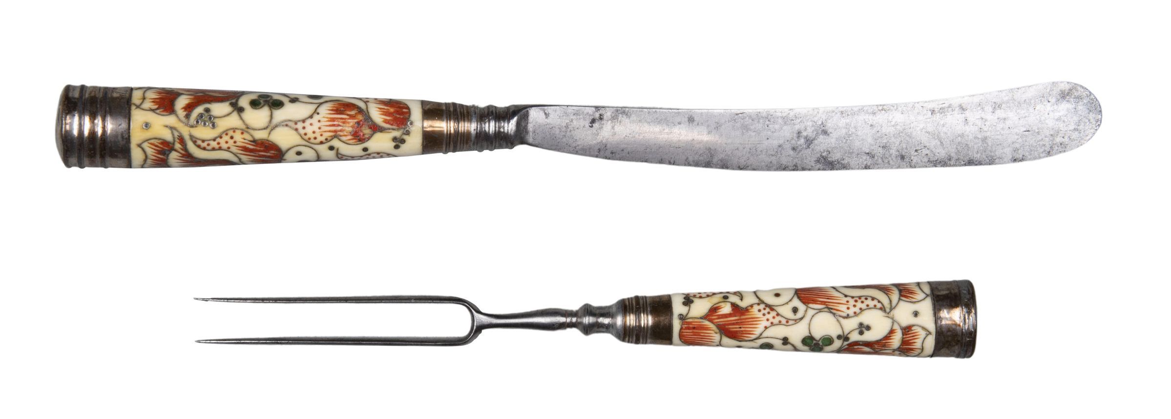 Handles: Ivory, flaring in shape, circular in section, with silver ferrules and flat caps; the ivory is decorated with a pattern of large tulips and small clover leaves executed in silver pique work, red and green composition.