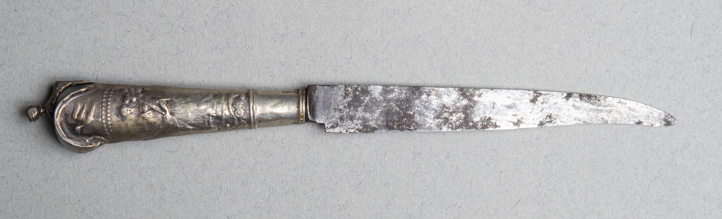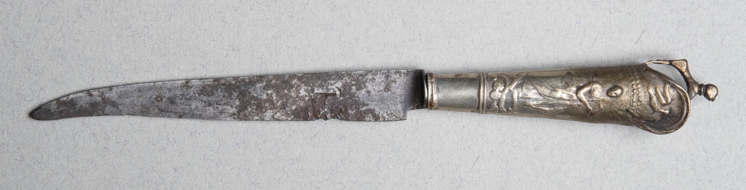 502.01 Knife: Steel blade. Silver handle with women classically draped on both sides with birds above. One woman holds a bird. Animal finial on top.