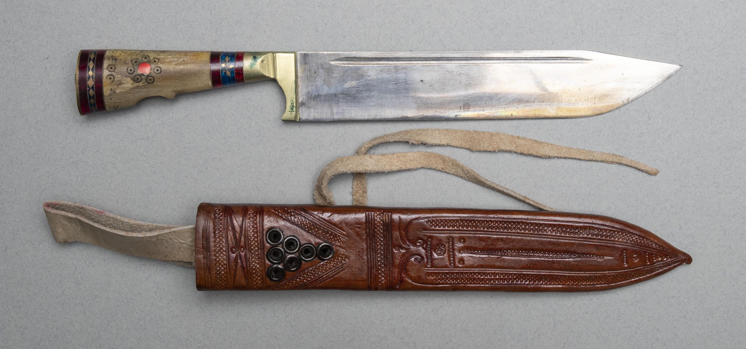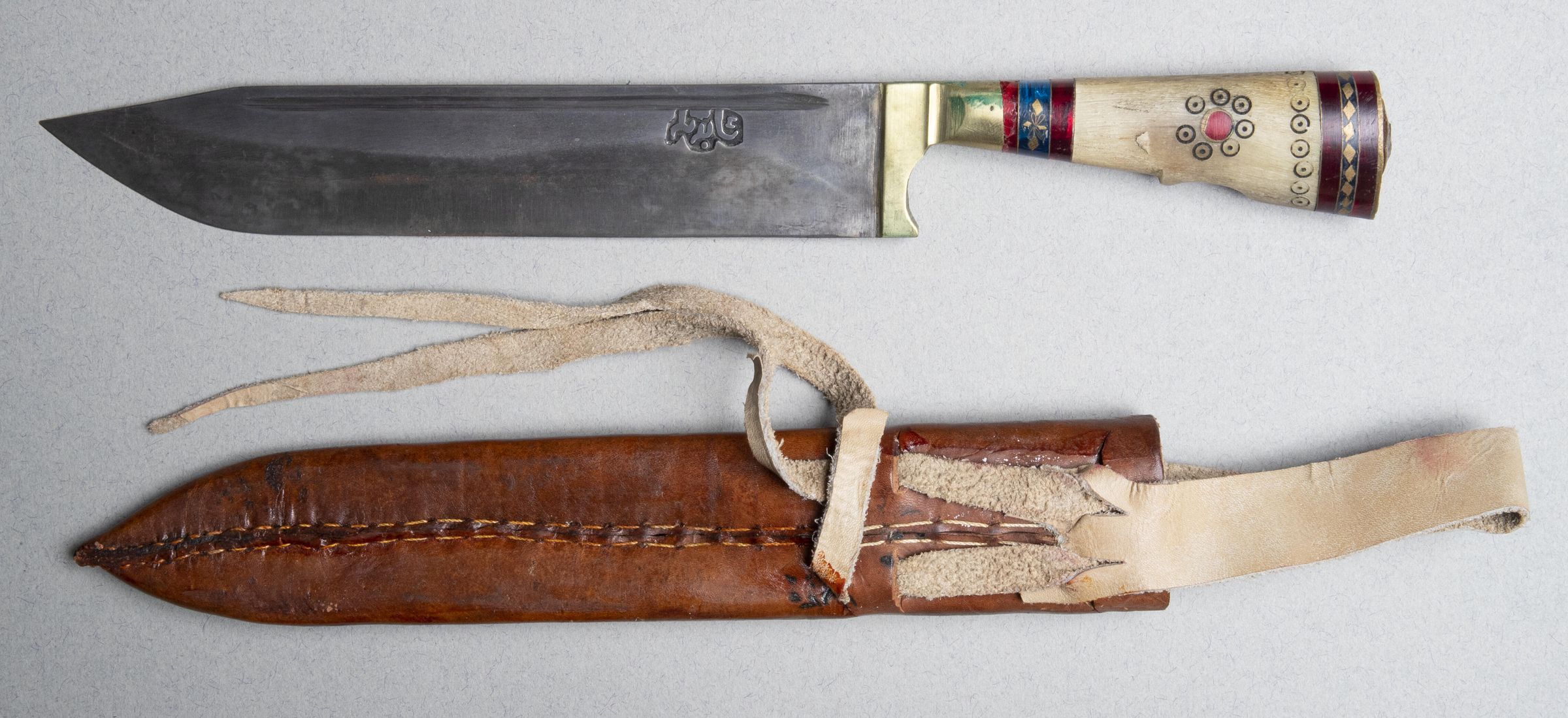 378.01 Knife: Steel blade with \"gutter\" or groove along top edge. Cast-on brass handle with horn grip inlaid with blue and red plastic (?) and bones. The blade marked with Chinese characters.