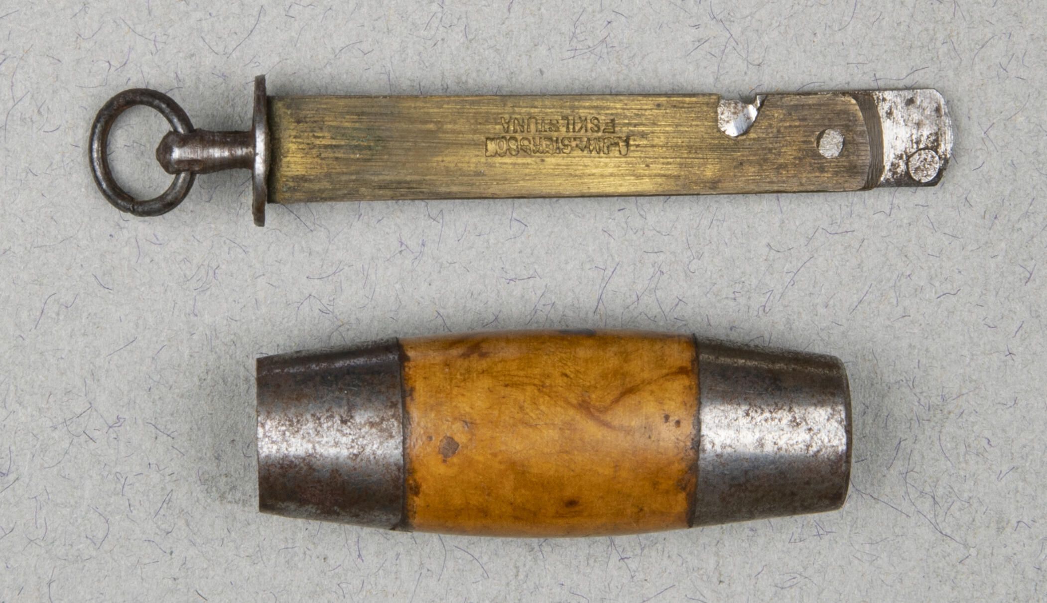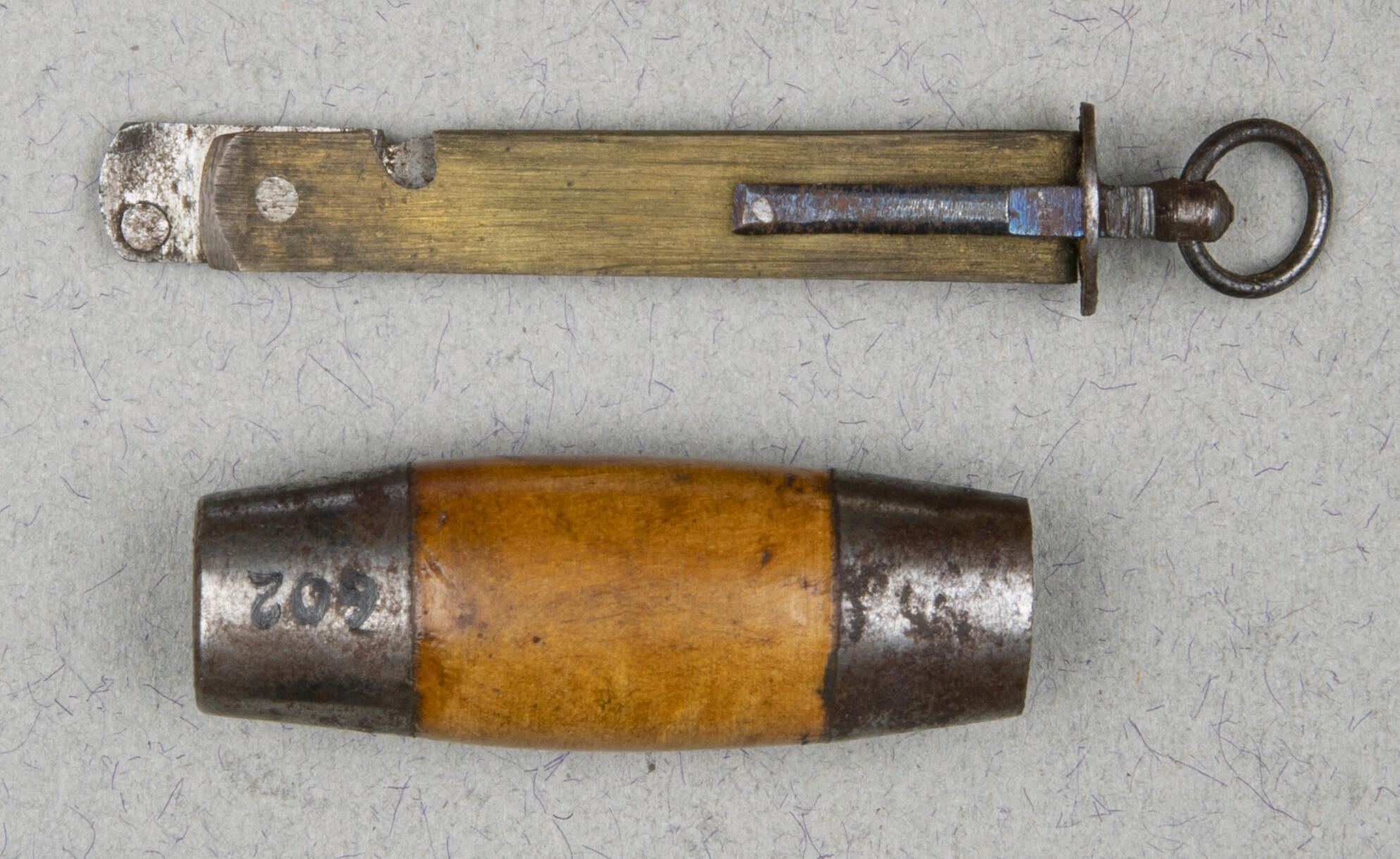 602.02 Case: Wood with steel caps at each end hollow to receive knife either shut when it functions as a case, or open when it functions as a cover for the handle.Collection