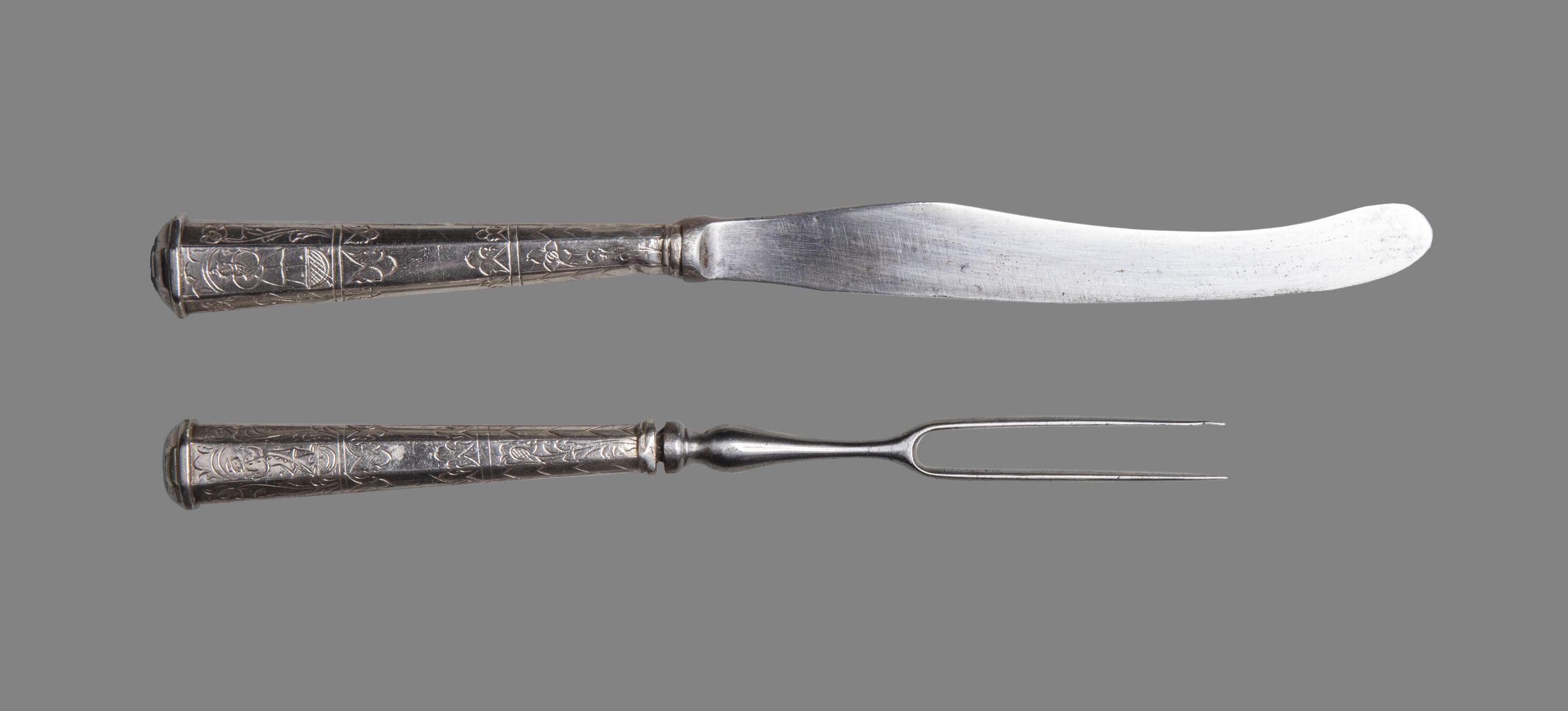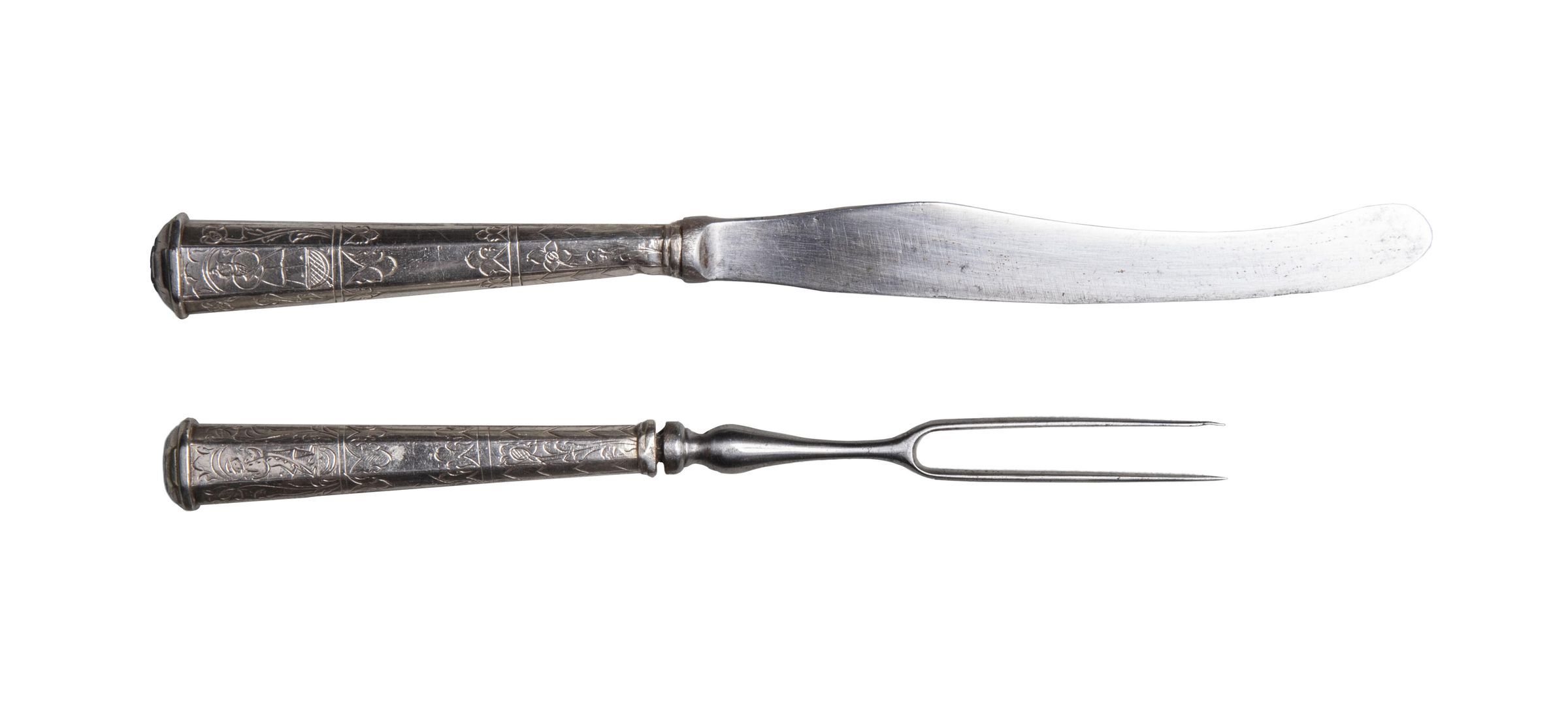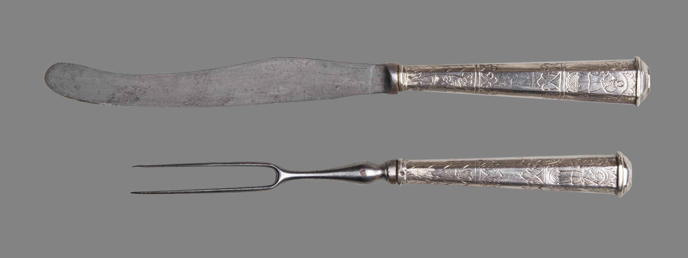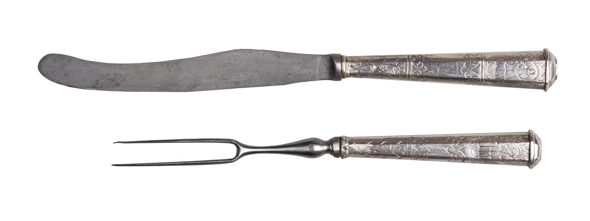 24.01 Knife: Blade sabre-shaped with round end and concave bolster. Handle silver-loaded, flaring in shape, and flattened octagonal in section, engraved with stylised tulips, chevious, acanthus leaves and men and women in niches, with a raised band round a domed top.