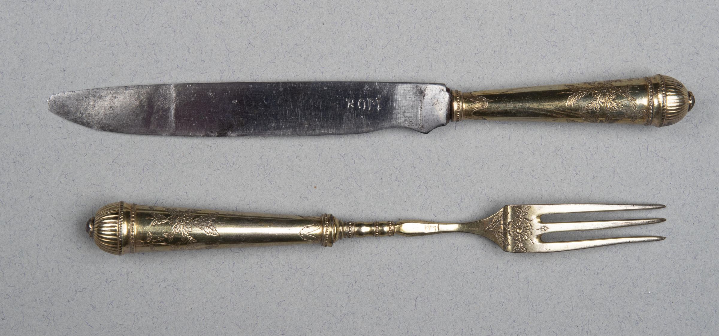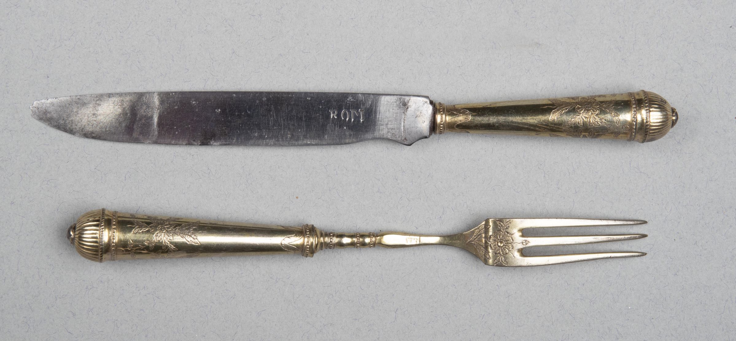 167.02 Fork: Head of silver gilt, with three slightly curved tines on a long baluster neck, flattened towards the head and of circular section, decorated with beaded mouldings towards the base. The fork head decorated with engraved foliage and flowers.